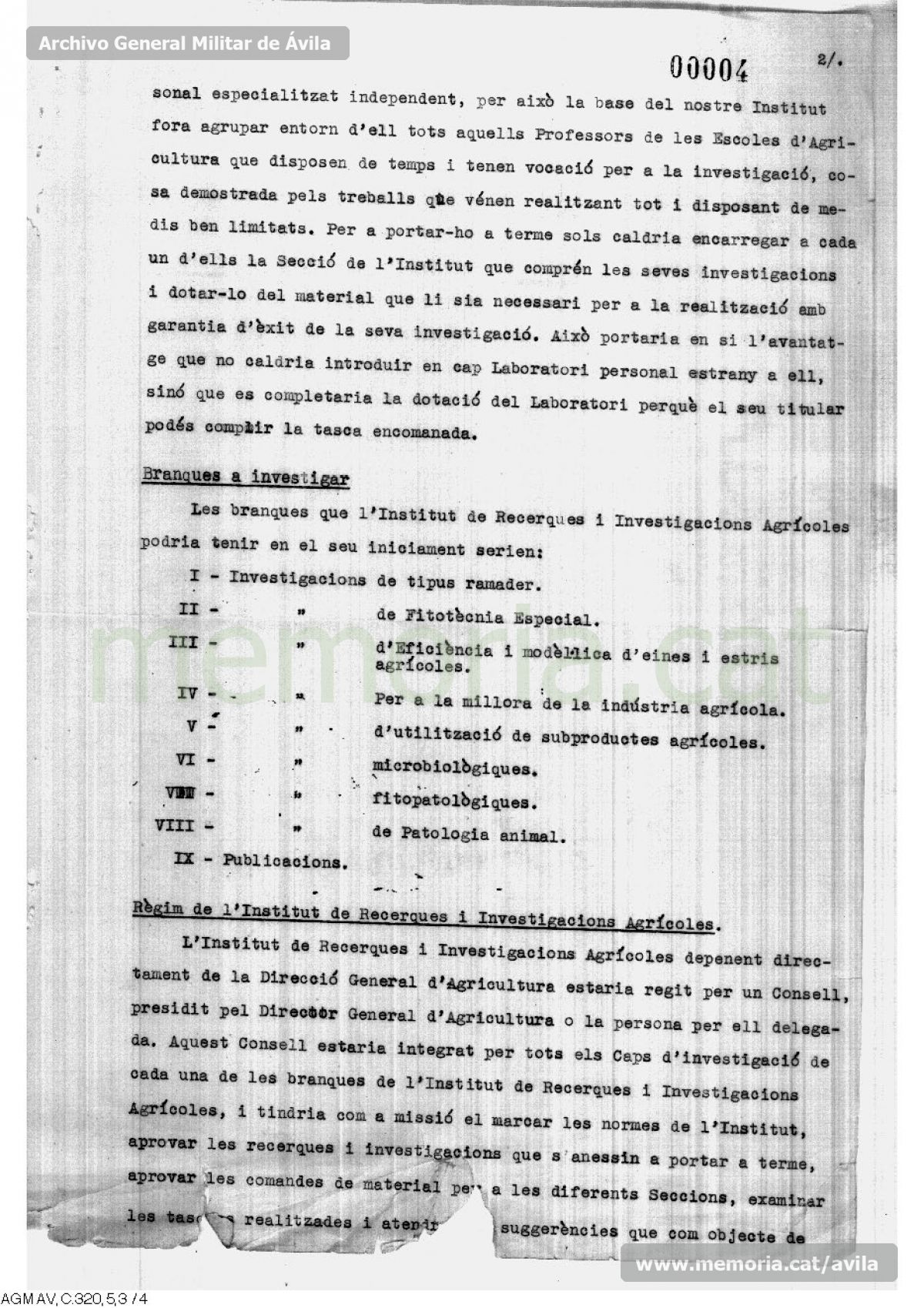 Projecte de l’Institut de Recerques i Investigacions Agrícoles, signat per J. Vidal de Càrcer. (Setembre del 1937)