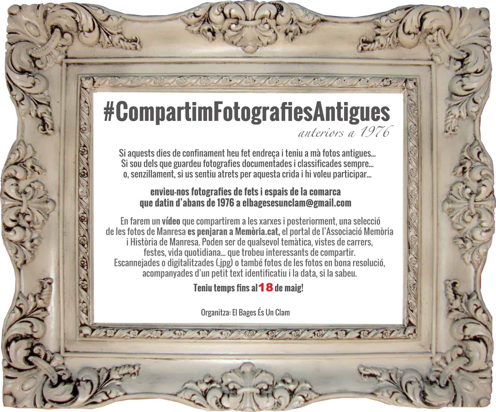 Us informem que la plataforma “El Bages és un clam” organitza una recollida de fotografies de la comarca del Bages anteriors a l’any 1976. La iniciativa va ser presentada per la nostra Associació i la plataforma la va acceptar de seguida.
