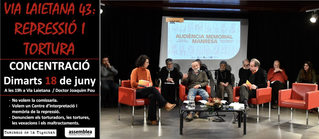 L’acte que organitza cada 15 dies la Comissió de la Dignitat, per reivindicar la transformació de l’actual comissaria de policia de Via Laietana 43 en un centre d’interpretació de la tortura i la repressió, comptarà dimarts vinent, dia 18, amb els testimoniatges del manresà Joan Sala i Fainé i d’Octavi Montagut Cardona.