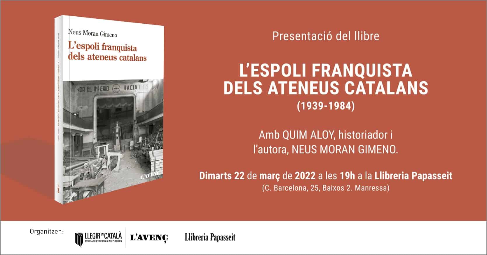 Dimarts vinent, dia 22 de març, a les 19h., a la Llibreria Papasseit de Manresa (carrer de Barcelona núm. 25), tindrà lloc la presentació del llibre L’espoli franquista dels ateneus catalans (1939-1984) de la historiadora Neus Moran.