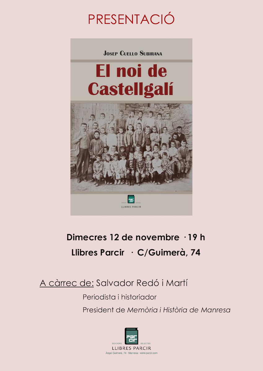 Dimecres dia 12 a les set de la tarda, presentació del llibre de l’escriptor manresà Josep Cuello Subirana: “El noi de Castellgalí”, a la llibreria Parcir de Manresa editora del volum.