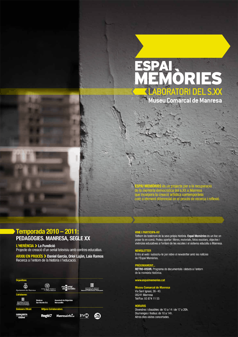 ESPAI MEMÒRIES és un projecte per a la recuperació de la memòria del segle XX a Manresa que incorpora la creació artística contemporània com a element diferencial en el procés de recerca i reflexió.