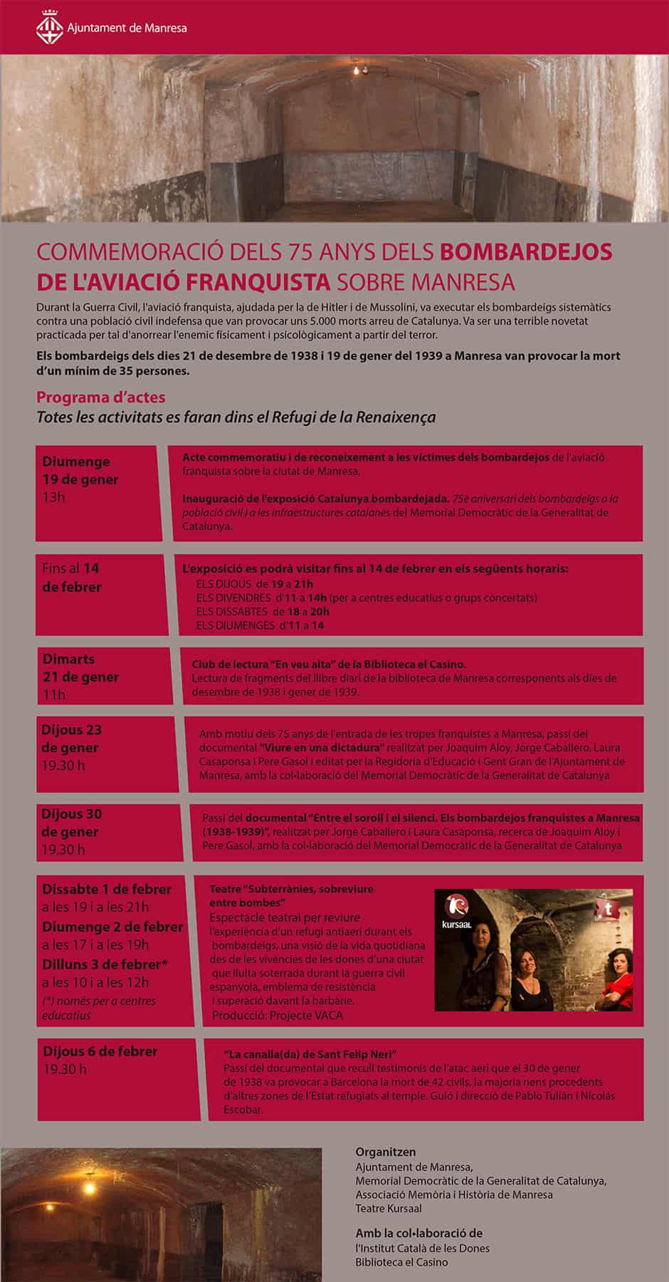 Aquest diumenge, 19 de gener, a les 13:00 h, a l’interior del refugi antiaeri del Grup Escolar Renaixença (carrer del Canonge Montanyà) se celebrarà un acte commemoratiu i de reconeixement a les víctimes dels bombardeigs de l’aviació franquista sobre Manresa, que ara fa 75 anys van produir la mort d’un mínim de 35 persones.