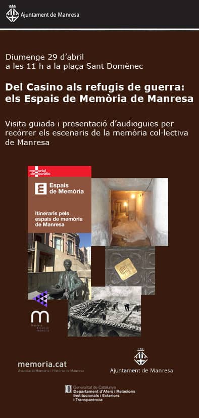 Aquest diumenge, dia 29, l’Ajuntament de Manresa i l’Associació Memòria i Història de Manresa organitzem una visita guiada, oberta a tothom, per diferents espais de la ciutat relacionats amb la memòria històrica. La cita és a les 11 hores del matí a la plaça de Sant Domènec.
