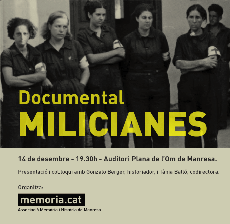 Aquest divendres, dia 14, a les 19.30h., a l’Auditori de La Plana de l’Om, de Manresa, (La Plana de l’Om núm. 5), es projectarà el documental “Milicianes” (Catalunya, 2017).