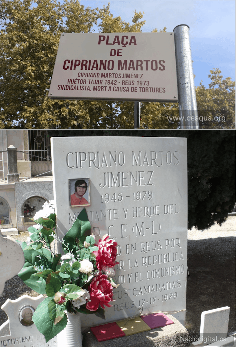 Cipriano Martos Jiménez (Huétor-Tájar,1942 – Reus,1973) era un obrer i sindicalista que va treballar a Sabadell, Terrassa i Reus. Era membre del FRAP. El 1973 va ser detingut per la Guàrdia Civil per la distribució de propaganda subversiva i per haver fet diverses pintades a Igualada. Després d’interrogatoris i tortures sense que confessés ni delatés ningú, se li va fer ingerir un líquid semblant al còctel Molotov, que li acabaria destrossant l’aparell digestiu i produint la mort al cap de vint dies.