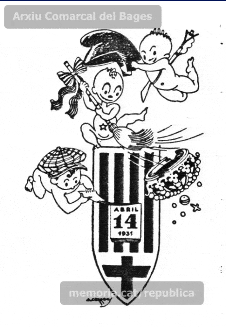 A la dreta, dibuix d’Anselm Corrons que simbolitza el canvi de règim de la Monarquia a la República