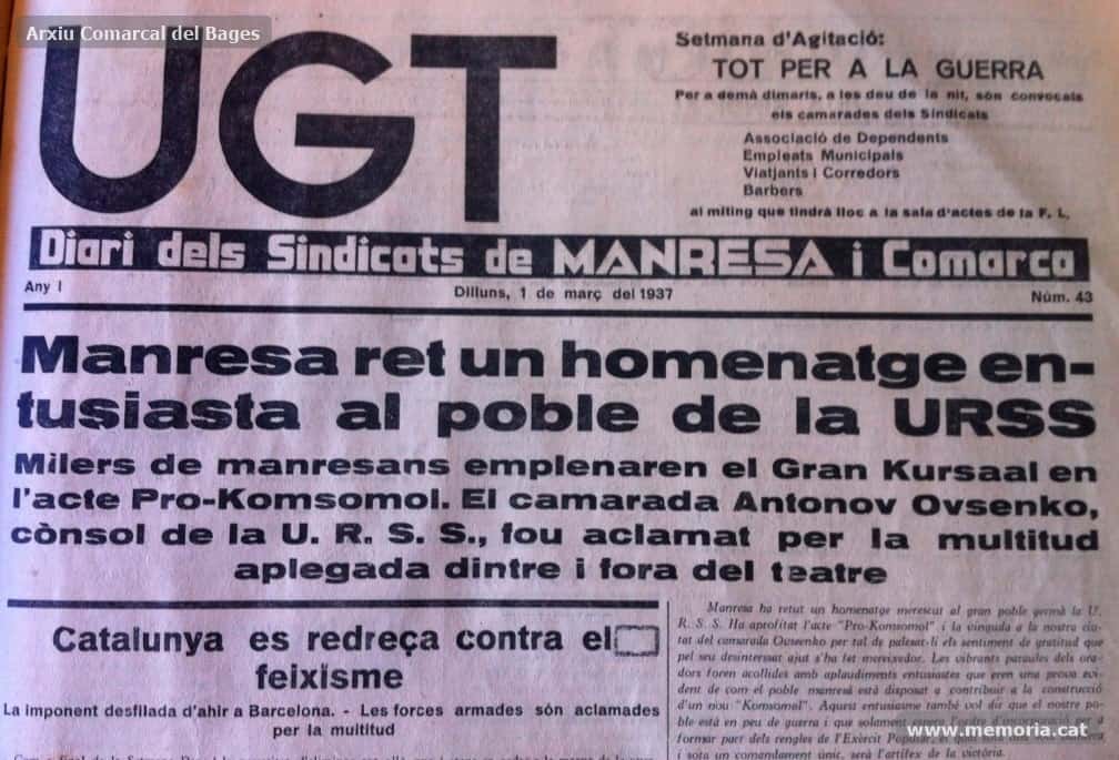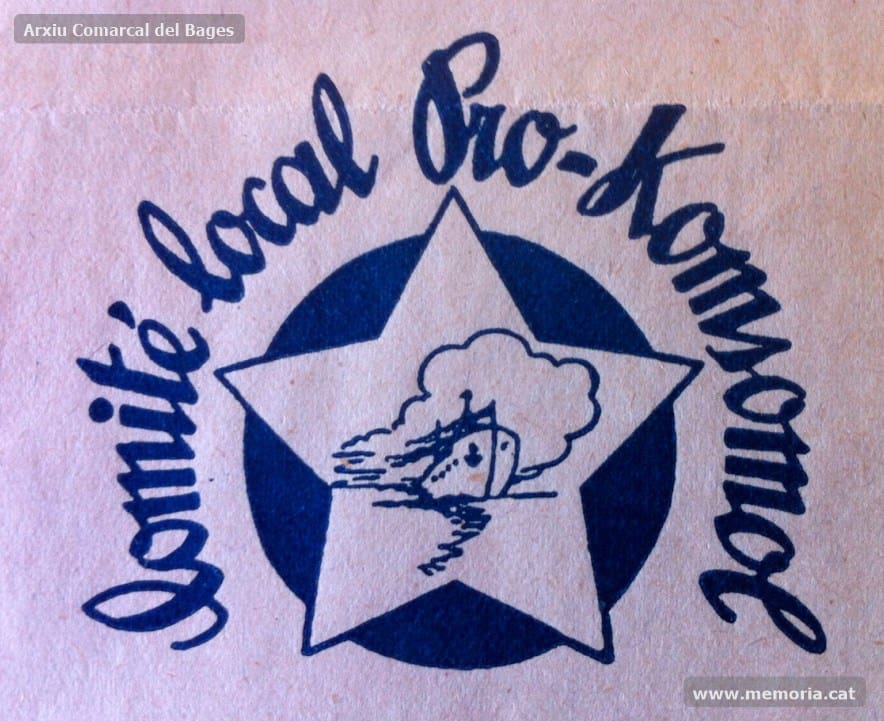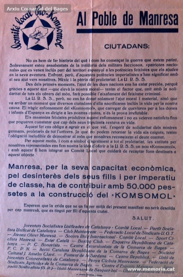 A Catalunya s’organitzà el Comitè Català Pro-Komsomol i a Manresa, el gener de 1937, es constituí el Comitè Local, que es proposà com a objectiu recaptar 50.000 pessetes per al nou Komsomol. El text de la pancarta és explícit: “La nostra consigna. La ciutat de Manresa contribuirà amb 50.000 Pts a construir el nou Komsomol”.