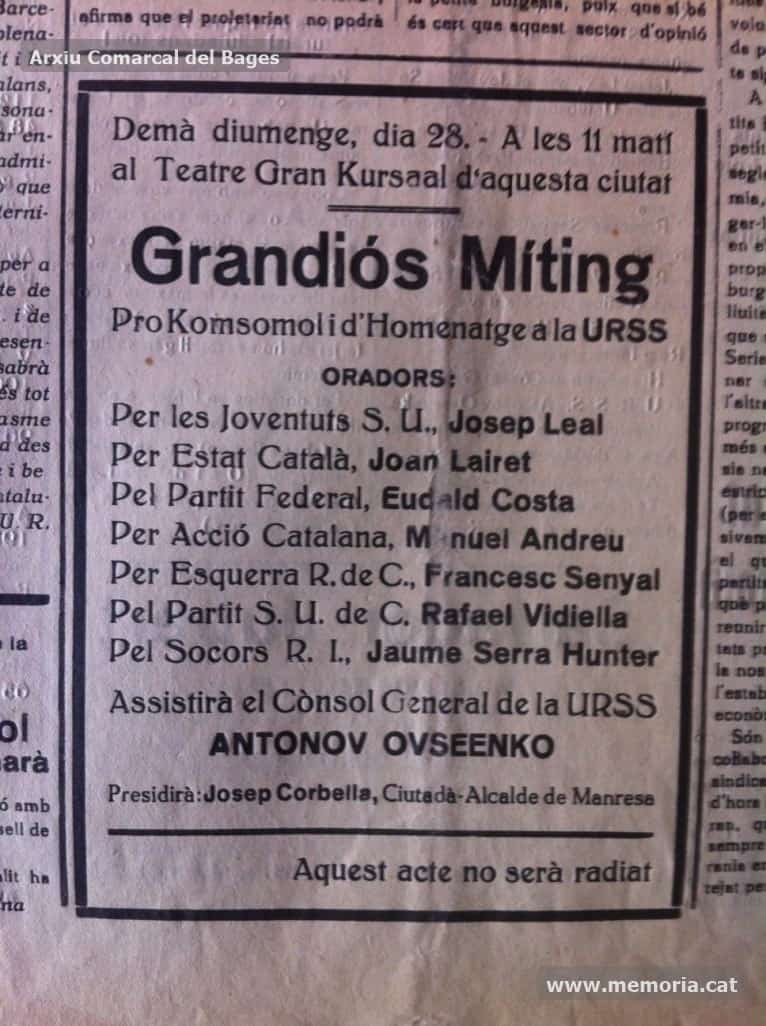 L’acte manresà més rellevant d’aquella campanya va ser el “Grandiós Míting ProKomsomol i d’Homenatge a la URSS” que es va celebrar al Teatre Kursaal el 28 de febrer i que va comptar amb les intervencions, entre d’altres, de Rafael Vidiella (conseller de Justícia de la Generalitat), Jaume Serra Húnter i l’ex-alcalde de Manresa Francesc Marcet. En una llotja hi havia el cònsol de la Unió Soviètica a Barcelona, Antonov Ovseenko, una persona que connectava amb la societat catalana i que, fins i tot, parlava català i que, en tornar a la URSS, va ser executat per ordre d’Stalin.