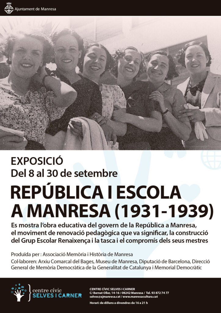 L’exposició “República i Escola (1931-1939)”, produïda el 2021 per l’Associació Memòria i Història de Manresa, es pot visitar fins al 30 de setembre al Centre Cívic Selves i Carner (C/ Bernat Oller, 14-16). L’horari és de dilluns a divendres, de 16 a 21 h.