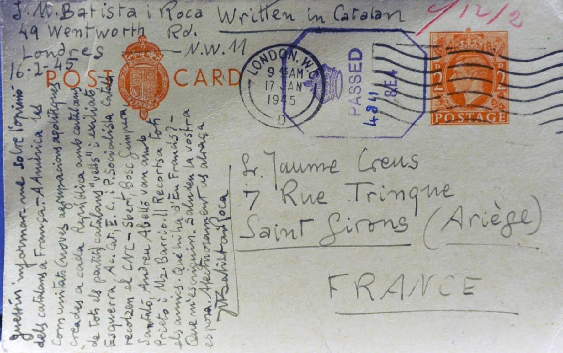 Batista i Roca informa Creus de la voluntat del Consell Nacional de ”obtenir la unió de tots els catalans” i li demana què sap de l’opinió dels catalans de l’interior: “Què sabeu de Barcelona? La clau de tot és el q. digui la nostra gent. Convindria molt q. mantinguéssiu amb els de l’interior tots els contactes que poguéssiu”. També mostra el seu convenciment que els guanyadors de la Segona Guerra Mundial no faran caure el règim de Franco.