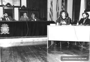 Peu de foto: 10/5/1985. Ajuntament de Manresa. Homenatge a Amat-Piniella. D’esquerra a dreta, l’alcalde Joan Cornet, Jacint Carrió, Joan Mestres, Montserrat Roig i Josep Emili Puig.