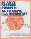 50 anys després de la mort del dictador, la impunitat i la desmemoria encara persisteixen. La lluita per la veritat, la justícia i la reparació continua sent imprescindible. Per això, seguim reclamant la desafecció policial de l’edifici de Via Laietana i l’accés íntegre als fons documentals, perquè esdevingui un espai per a la memòria, per la justícia i la dignitat.