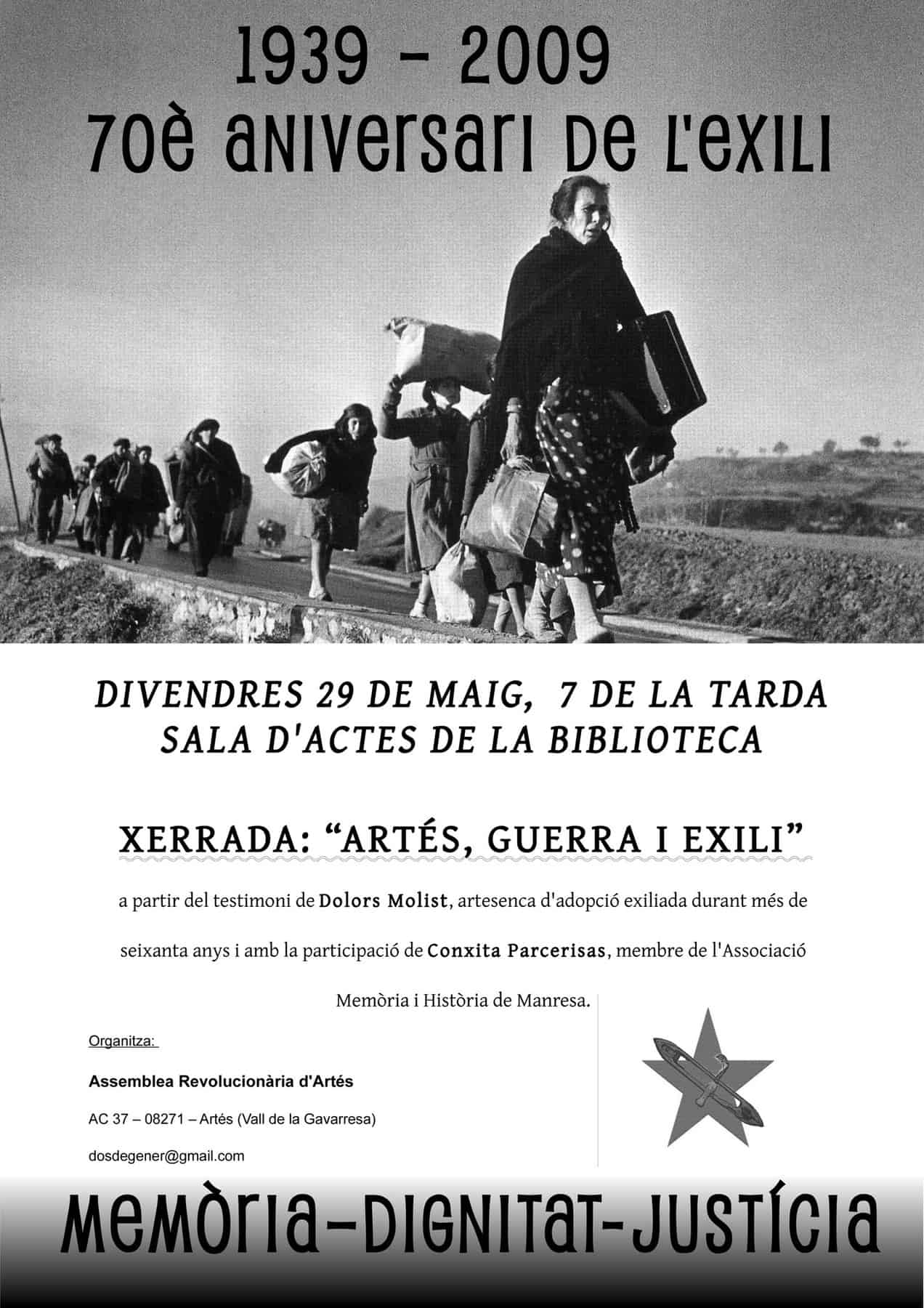 Aquest divendres, dia 29, les 7 de la tarda, tindrà lloc a la sala d’actes de la Biblioteca d’Artés la xerrada “Artés, guerra i exili”, a partir del testimoni de Dolors Molist, artesenca d’adopció exiliada durant més de seixanta anys. A l’acte hi participarà també Conxita Parcerisas, membre de la nostra Associació.