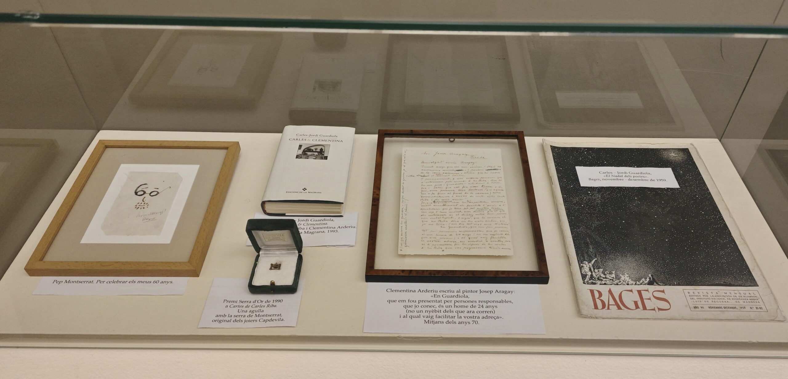 El resultat és una Mostra efímera pel poc temps que dura, que podreu veure instal·lada en les vitrines situades a la sala del costat. [Vegeu les fotografies de les vitrines al final del text]. Tots els objectes exposats formen part personal de tres espais: les arrels manresanes, l’activitat editorial a Edicions de la Magrana i l’edició de les Cartes de Carles Riba. Tres espais que han estat i són centrals en la meva vida. Espero que en gaudiu.