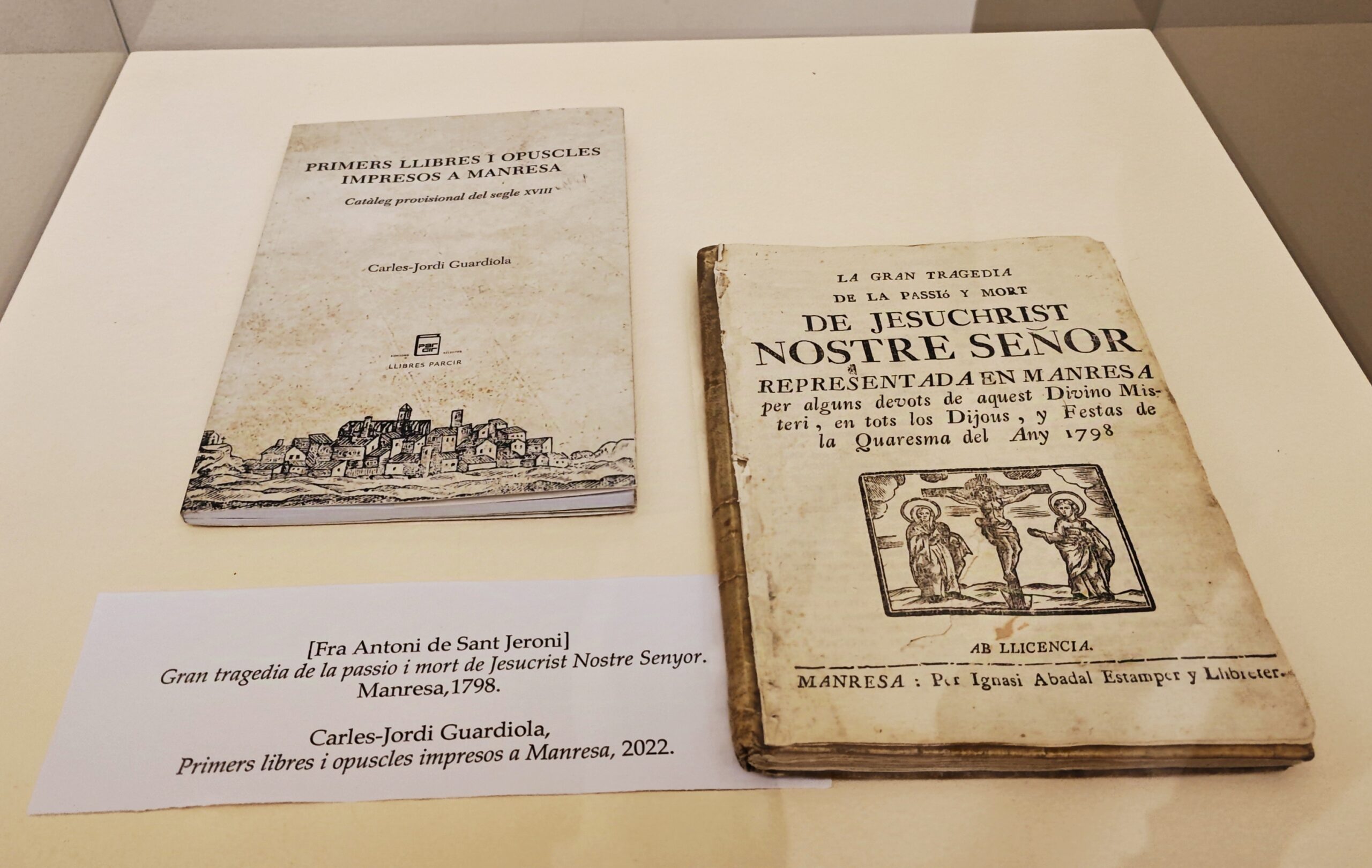 - Finalment, exposo l’exemplar únic de la Gran tragèdia de la Passió i Mort de Jesucrist Nostre Senyor, impresa a Manresa el 1798, que ha de ser lliurat en donació a la ciutat on va ser impresa. L’acompanya el meu llibre Primers llibres i opuscles impresos a Manresa.