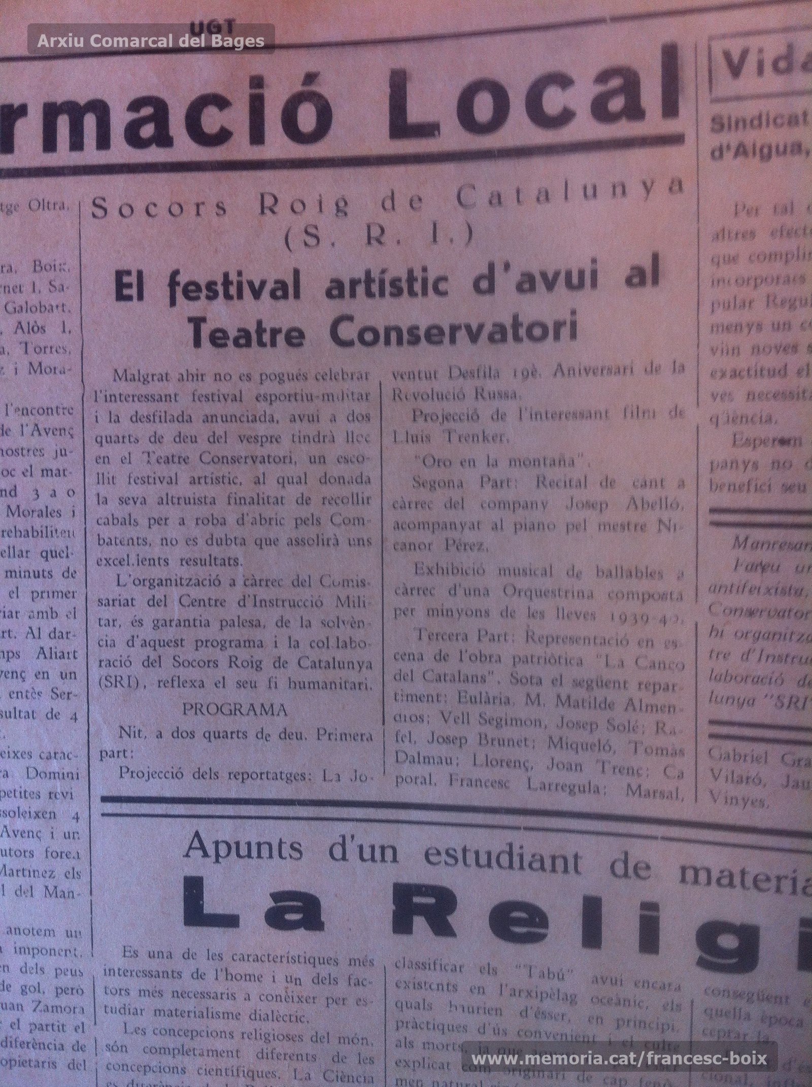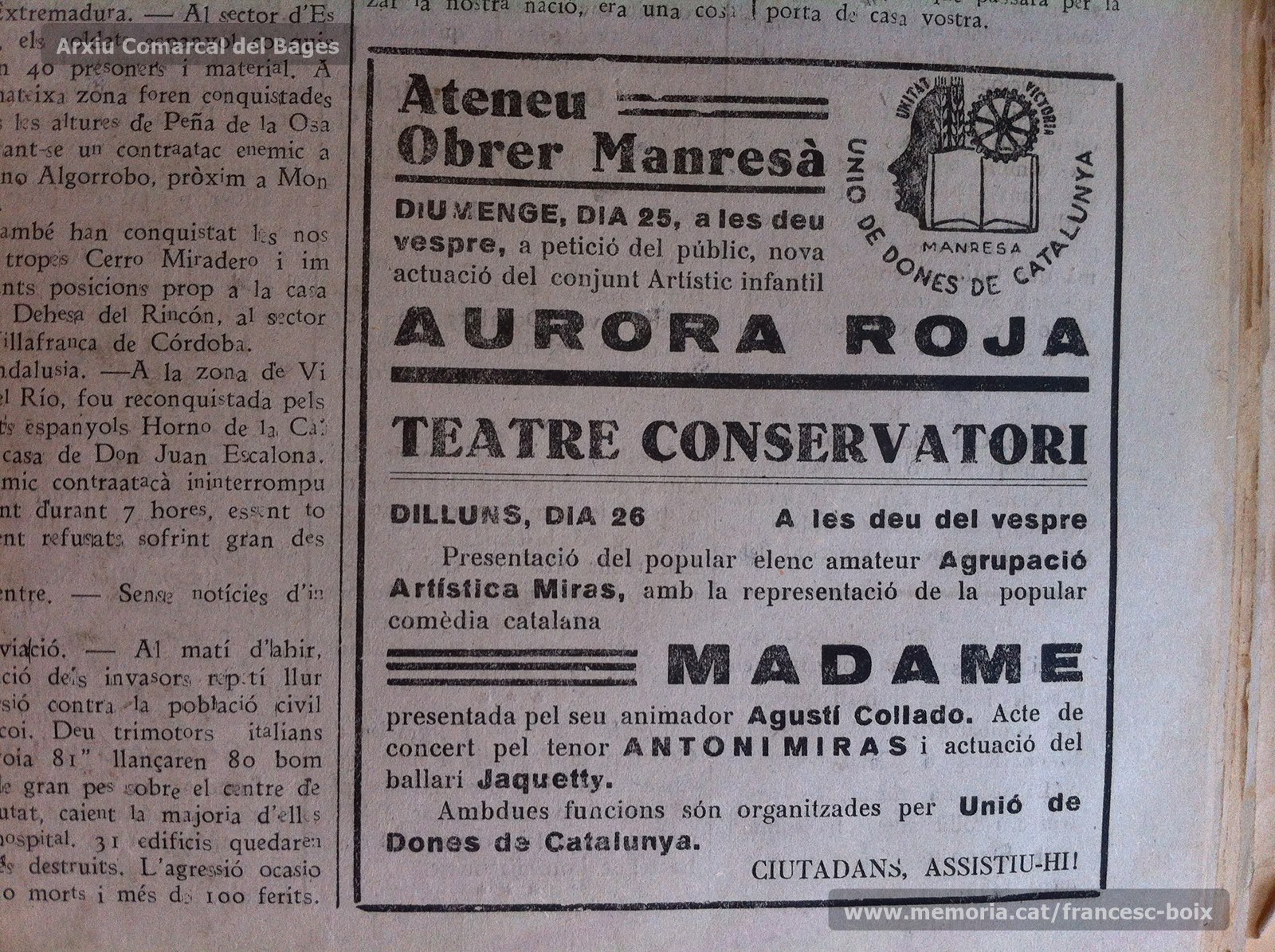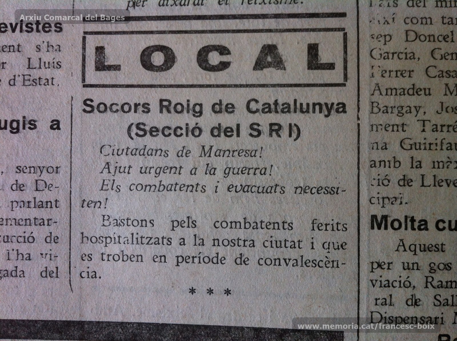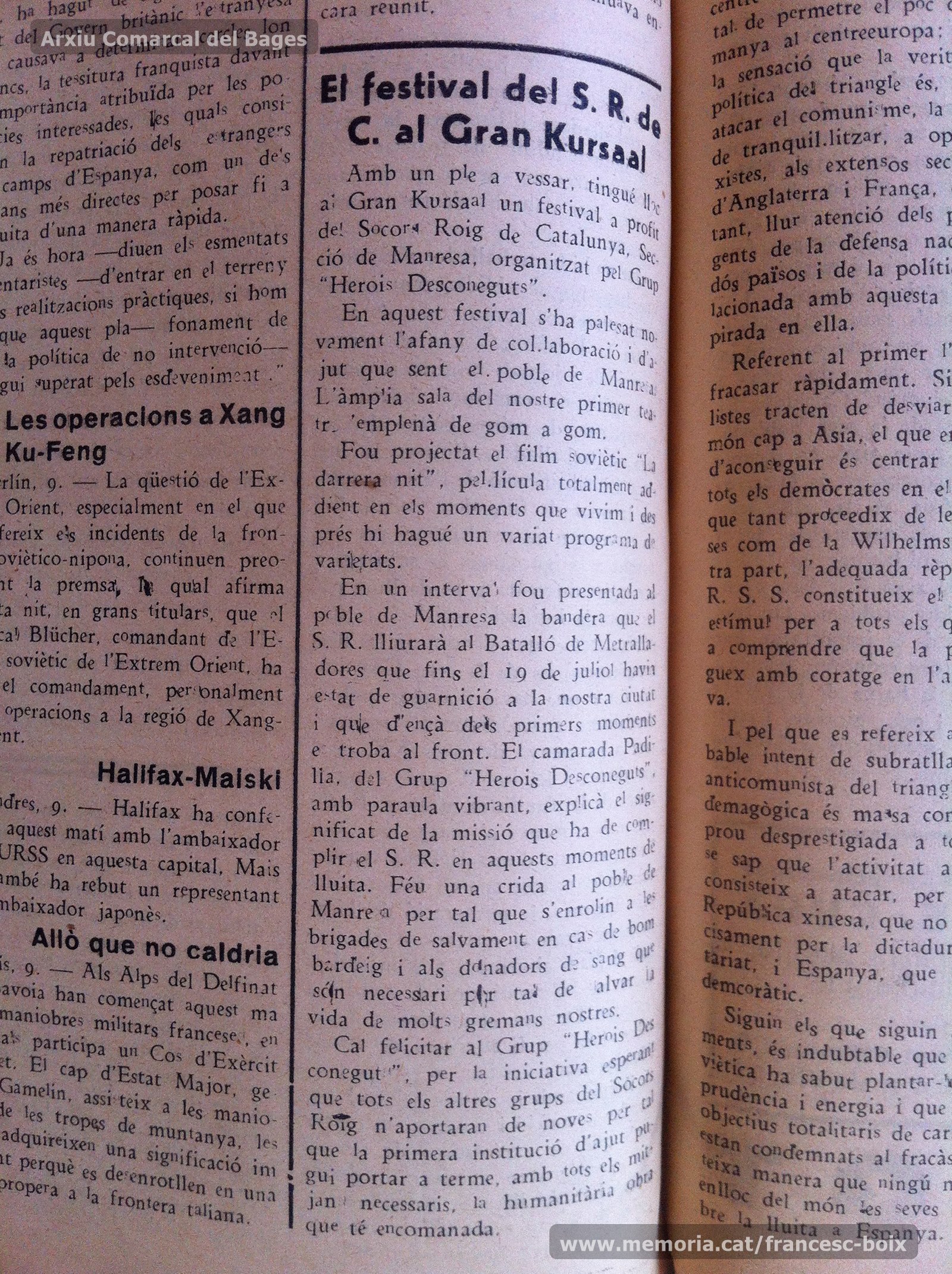 En aquest apartat us adjuntem documents i retalls de premsa de les tres organitzacions manresanes que conjuntament o individualment haurien pogut organitzar l’acte del Teatre Kursaal fotografiat per Francesc Boix. Van destacar a Manresa per la seva ingent activitat de suport als soldats que es trobaven al front de guerra.