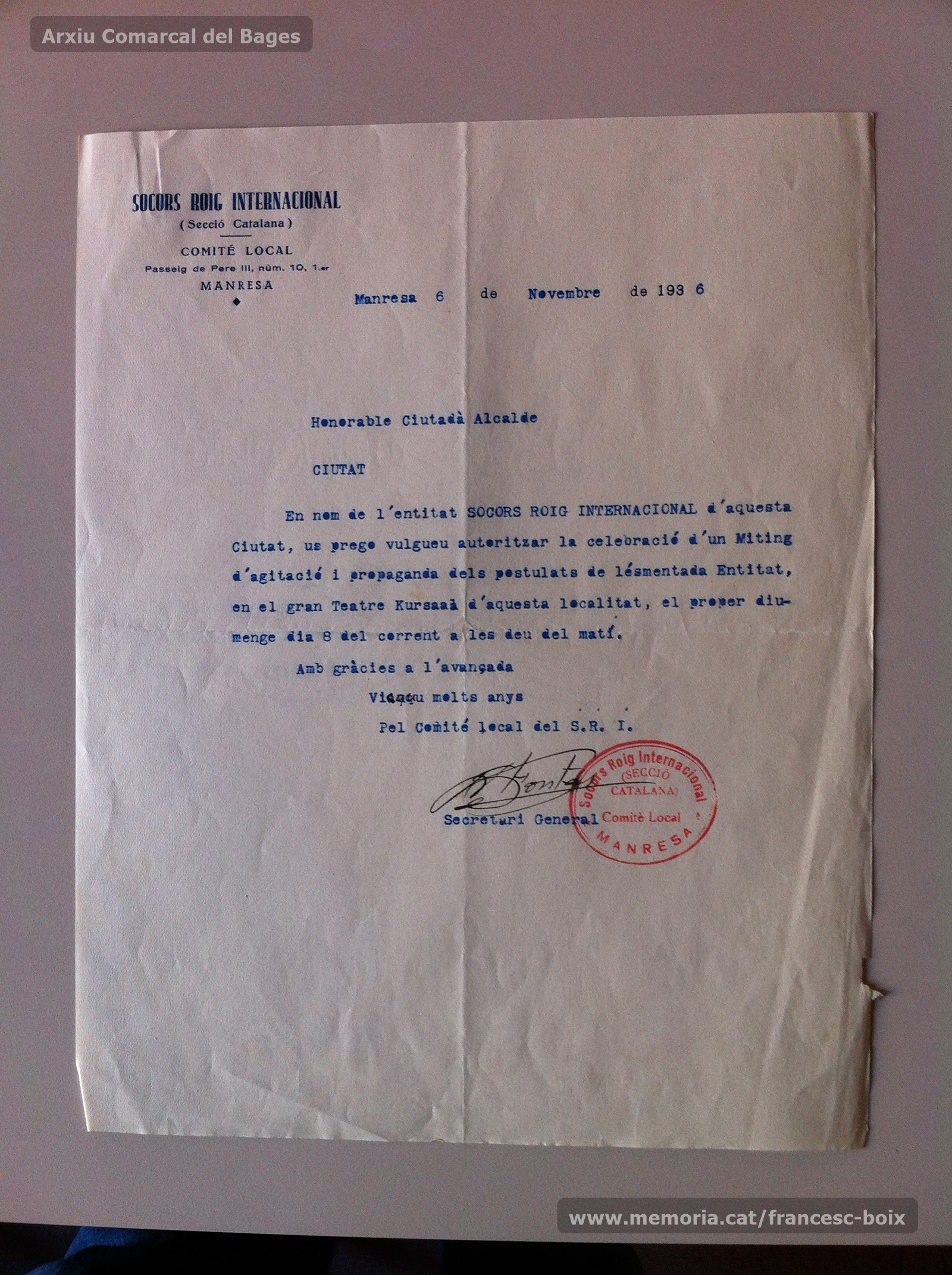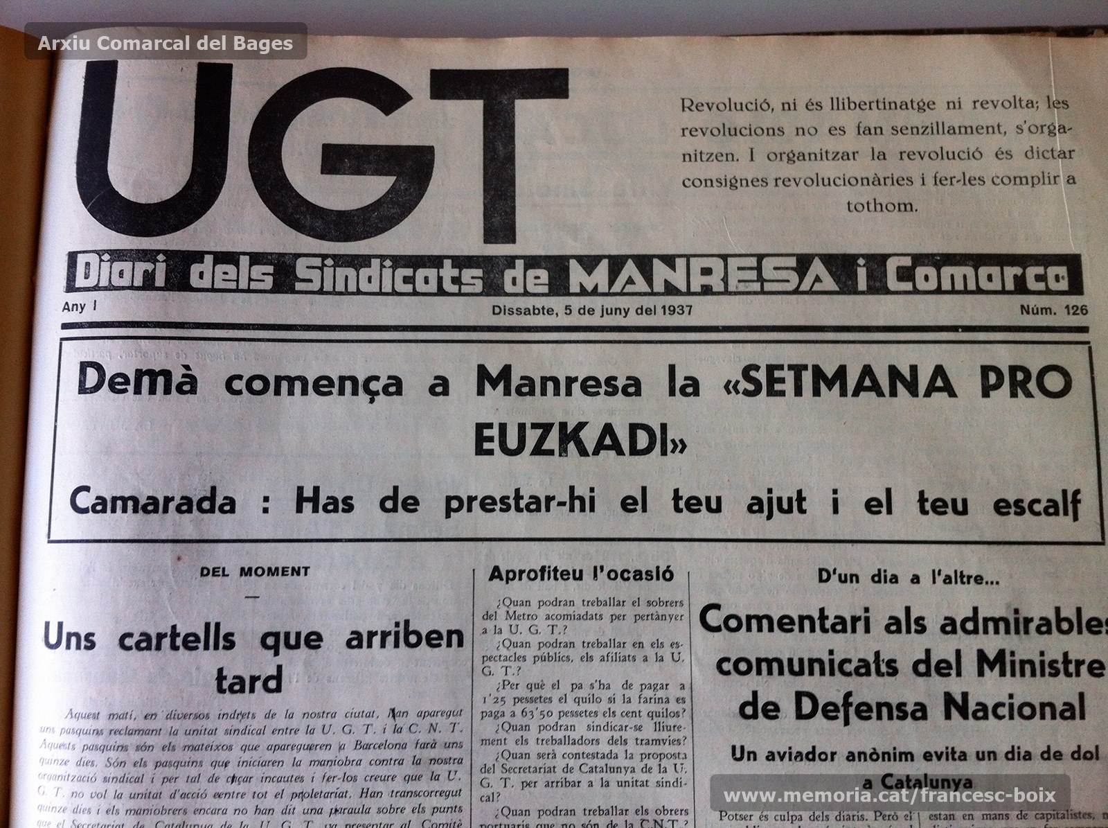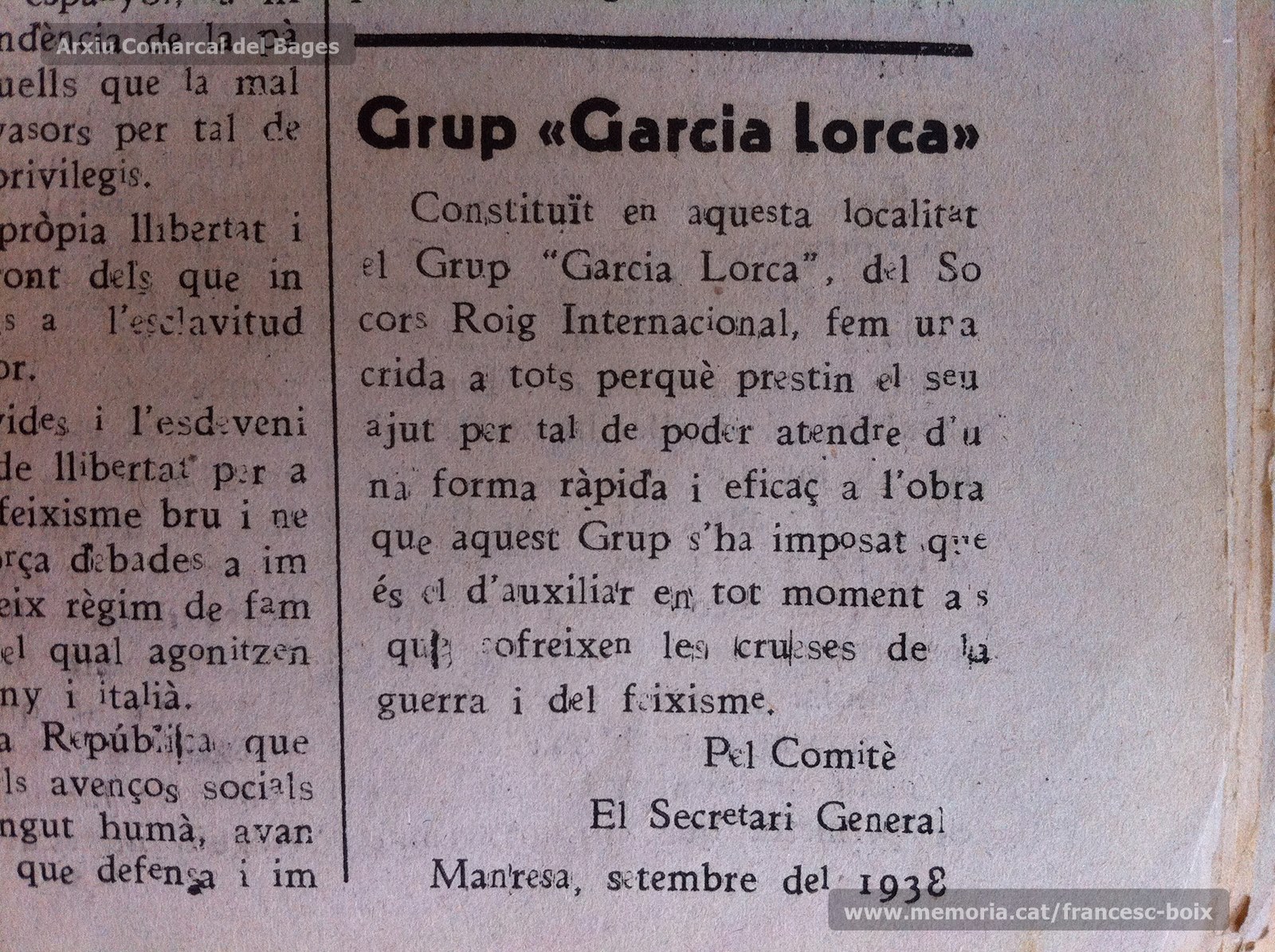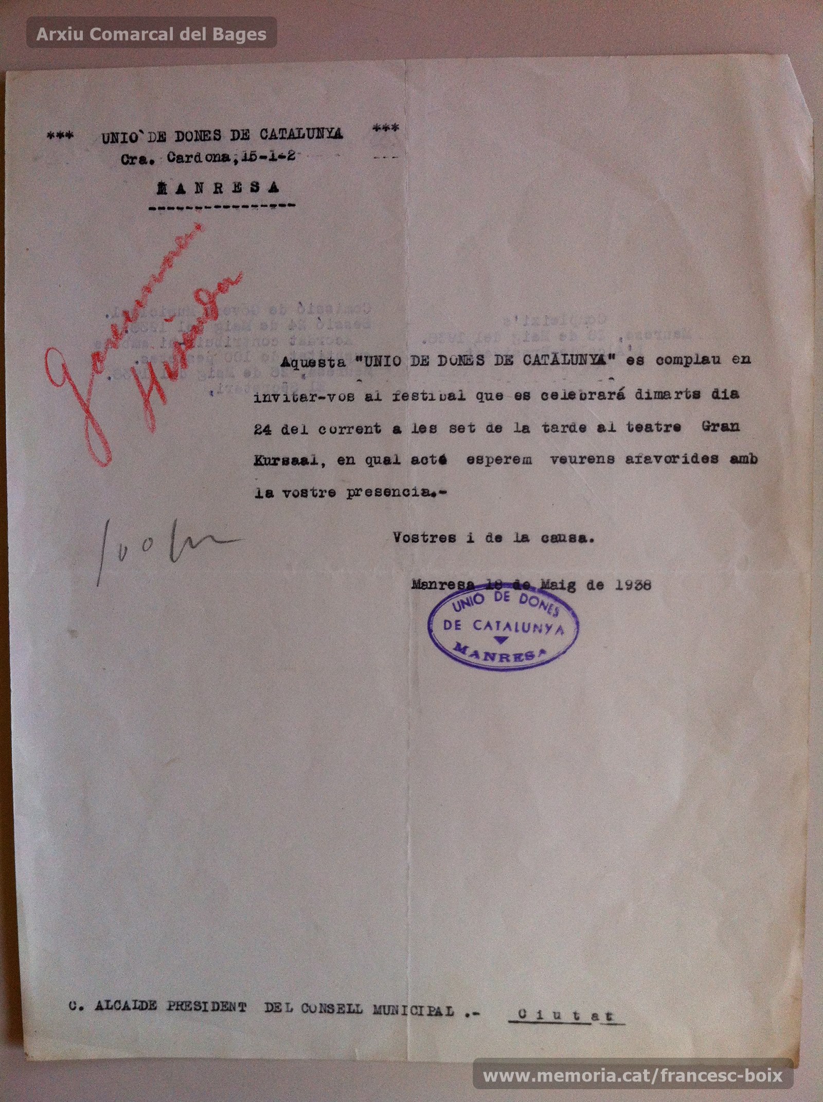 En aquest apartat us adjuntem documents i retalls de premsa de les tres organitzacions manresanes que conjuntament o individualment haurien pogut organitzar l’acte del Teatre Kursaal fotografiat per Francesc Boix. Van destacar a Manresa per la seva ingent activitat de suport als soldats que es trobaven al front de guerra.