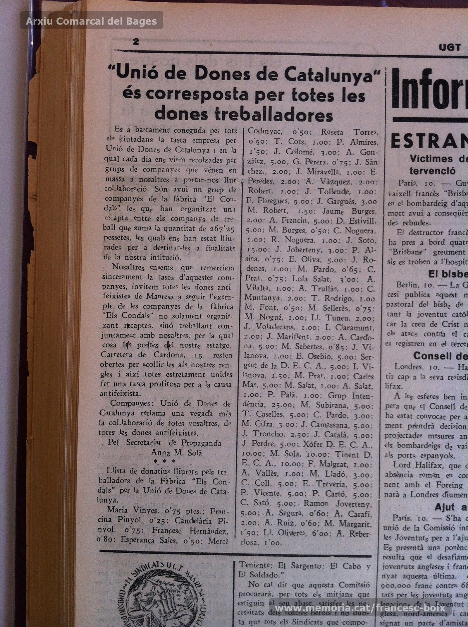 Documents i retalls de premsa manresans sobre el Socors Roig Internacional, les Joventuts Socialistes Unificades i la Unió de Dones de Catalunya (1936-1938)