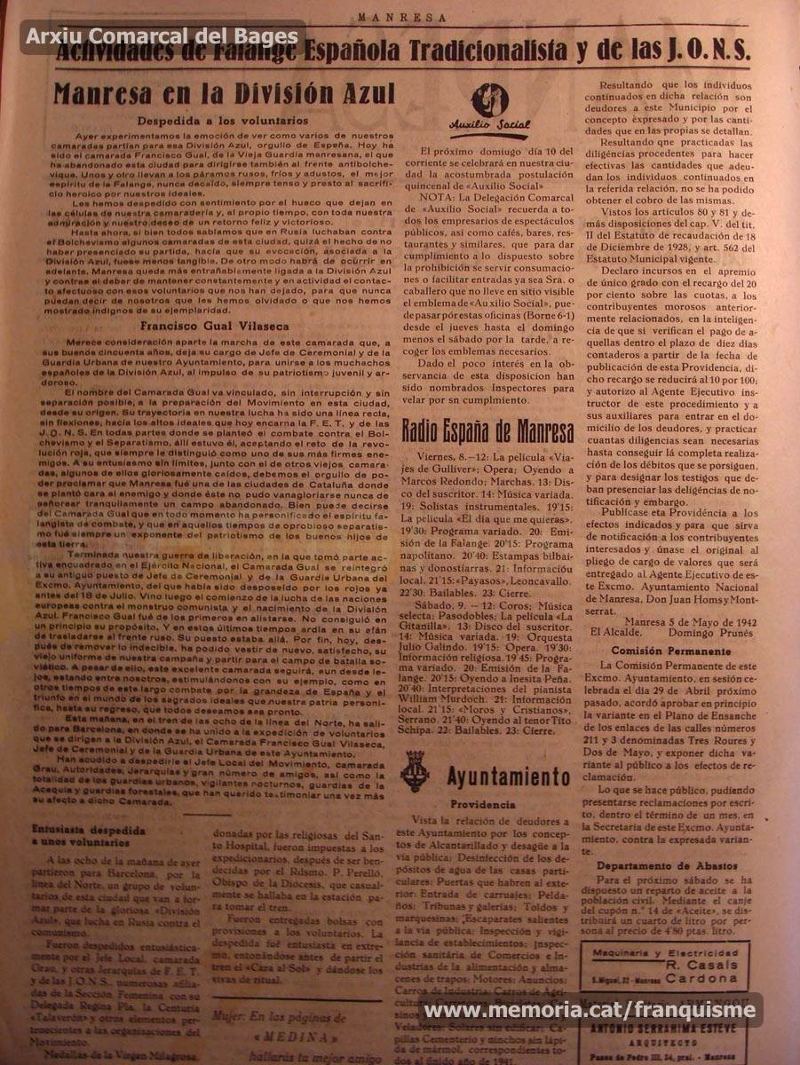 Manresa, 7/5/1942: noticia sobre la marcha de varios voluntarios con la División Azul, «orgullo de España«; en la que destaca la referencia al jefe de ceremonial del Ayuntamiento y jefe de la Guardia Urbana, Francesc Gual Vilaseca, que «en estos últimos tiempos ardía en su afán de trasladarse al frente ruso». Según se lee, «en todas partes donde se planteó el combate contra el Bolchevismo y el Separatismo, allí estuvo él [Francesc Gual], aceptando el reto de la revolución roja, que siempre le distinguió como uno de sus más firmes enemigos…». (Arxiu Comarcal del Bages).