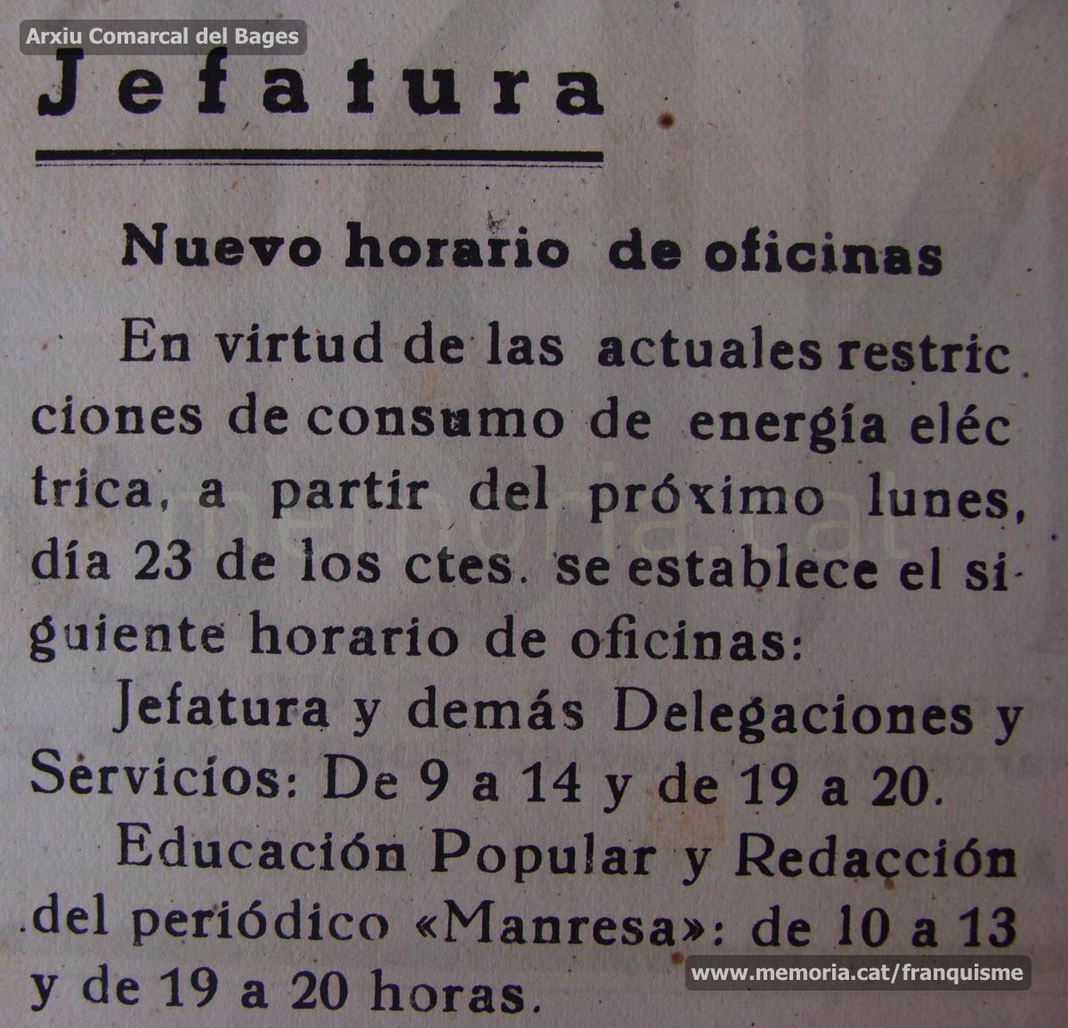 “Manresa”, 2/10/1944: comunicació de la reducció d’horaris de diferents serveis com a conseqüència de les restriccions elèctriques, a més de recordar l’obligació de complir les directrius marcades sobre el consum energètic. (Arxiu Comarcal del Bages).