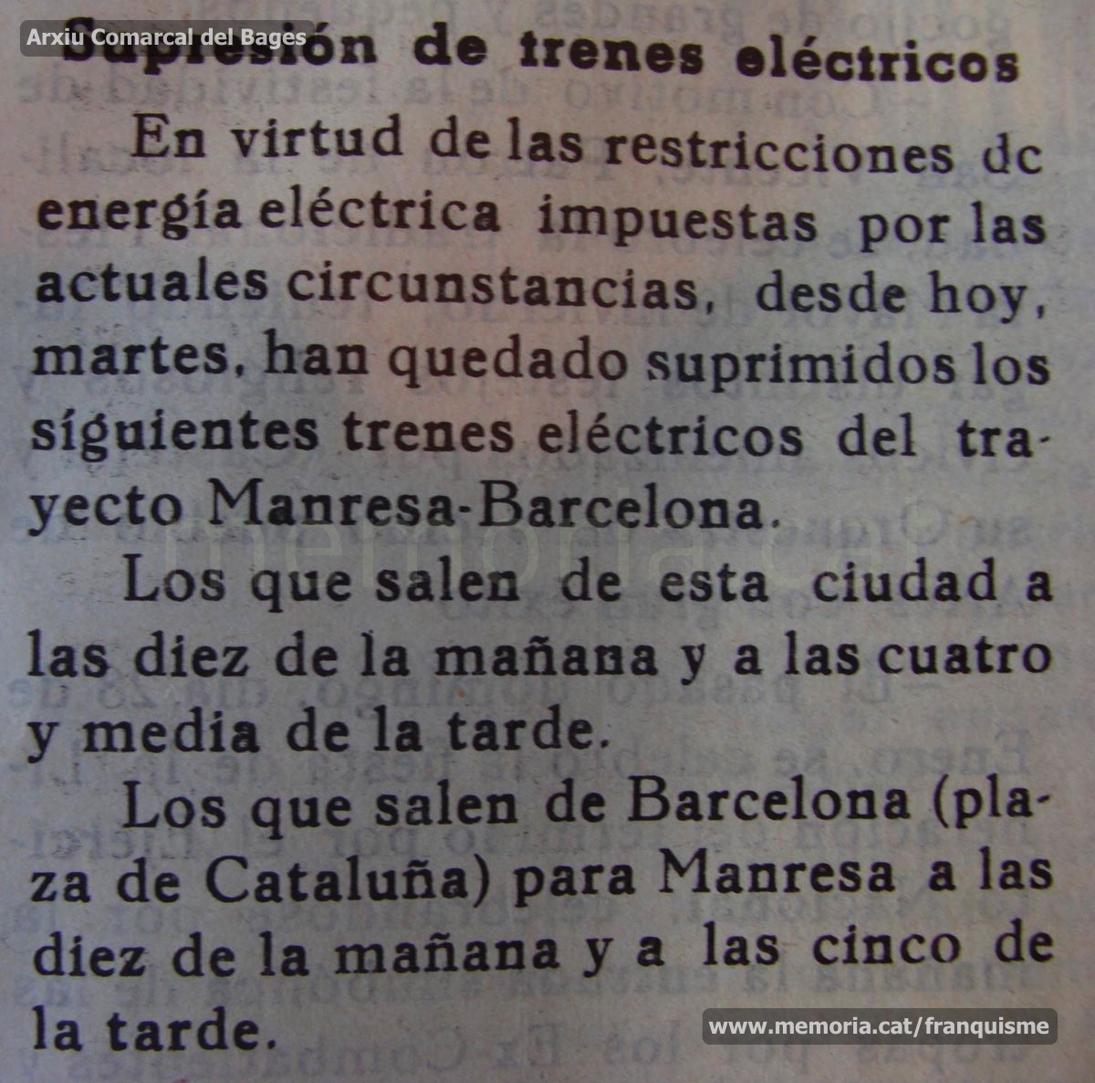 “Manresa”, 6/2/1945: “Supresión de trenes eléctricos”. Notícia sobre la suspensió d’alguns trens que efectuen el trajecte entre Manresa i Barcelona, com a conseqüència de les restriccions elèctriques. (Arxiu Comarcal del Bages).