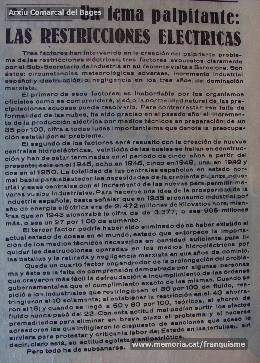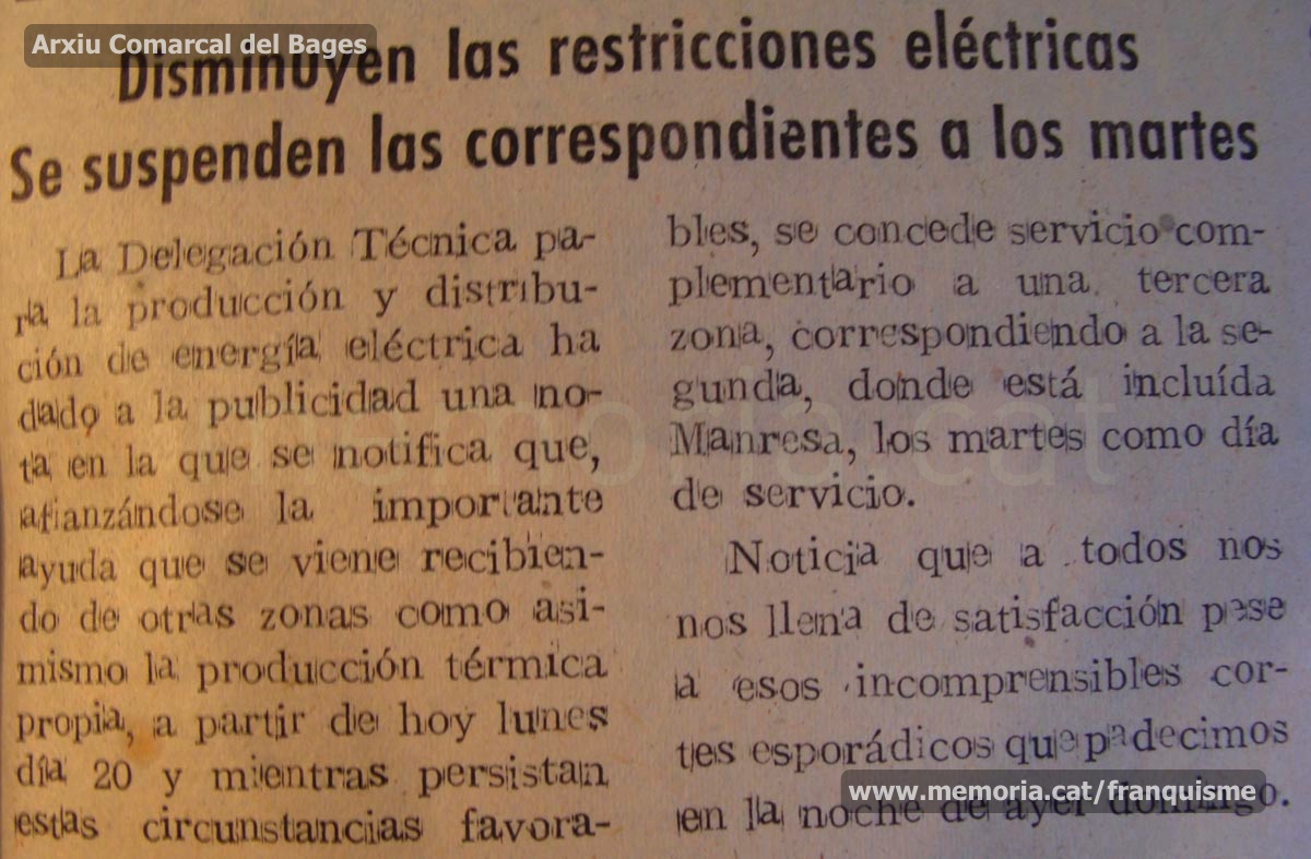 “Manresa”, 1/3/1947:“Unas cifras sobre el problema eléctrico”. Informació oficial del règim que vol justificar les restriccions elèctriques: “Del 44 al 46 la marcha rápida de España en su industrialización, la dificultad de construir nuevas centrales a causa de la guerra mundial y la sequía que castigó a Europa y que ha sido la mayor del siglo, originaron las restricciones eléctricas […] Para 1950, todas nuestras industrias estarán holgadamente servidas de energía eléctrica […] ¿Puede existir un síntoma más expresivo de prosperidad?”. (Arxiu Comarcal del Bages).