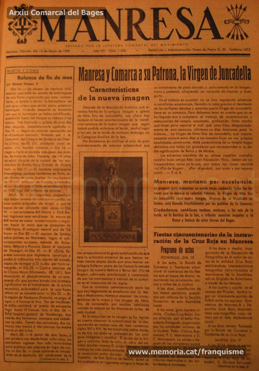 “Manresa” 14/5/1949: notícia de la benedicció de la nova imatge de la Mare de Déu de Joncadella, que se celebrarà l’endemà. (Arxiu Comarcal del Bages)