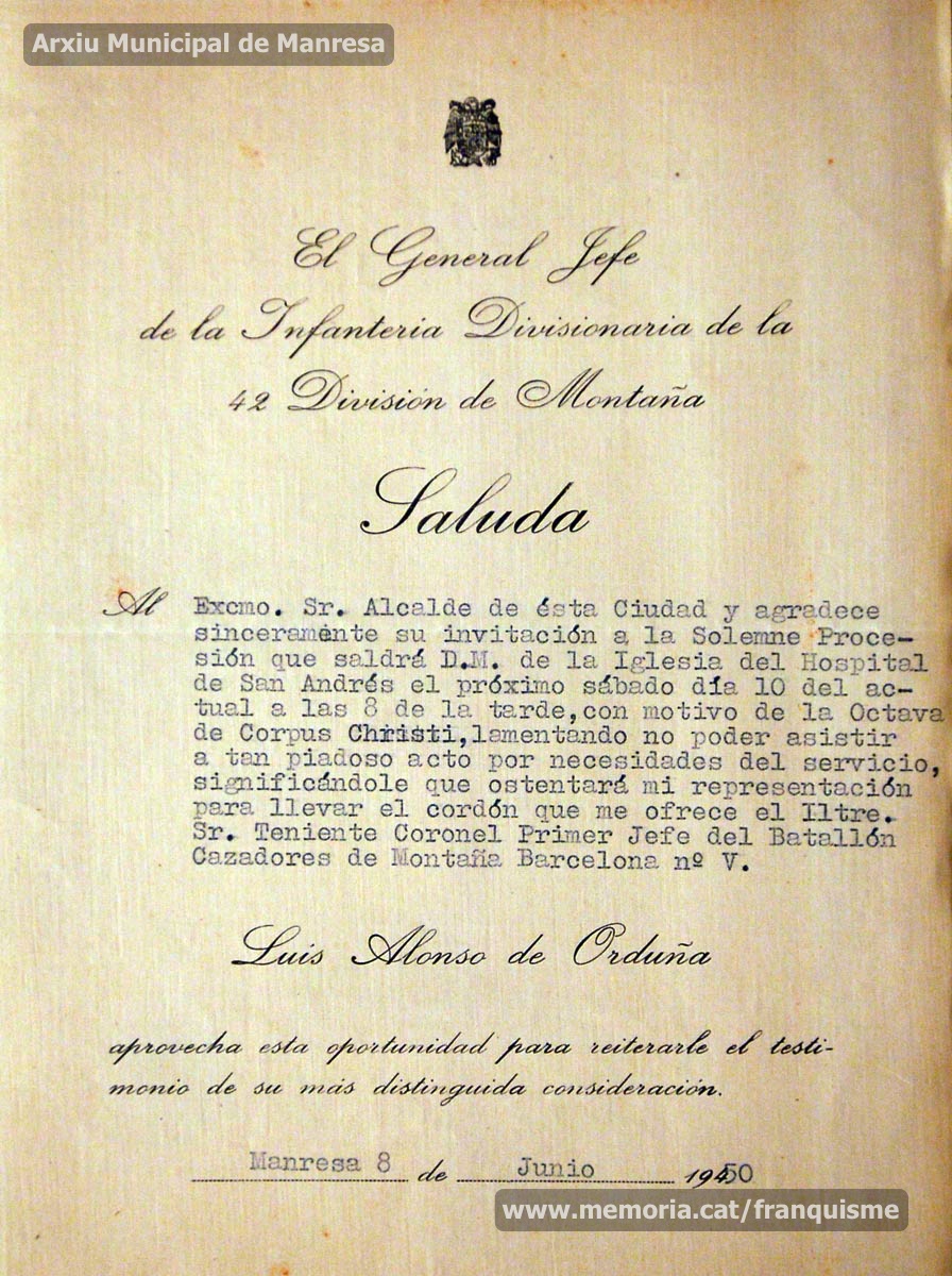 Juny del 1950: saluda de l’alcalde Joan Prat Pons al “Sr. Juez de 1ª Instancia e Instrucción” i al “Excmo. Sr. General Jefe de la Infantería Divisionaria de la 42 División de Montaña y Comandante Militar de la Plaza”, Luis Alonso de Orduña, al qual proposa que acompanyi el seguici de la processó tot portant un dels cordons del pendó principal del Corpus. Resposta del general, que lamenta no poder assistir-hi per motius de feina, però que delega la seva representació en el tinent coronel. (Arxiu Municipal de Manresa)