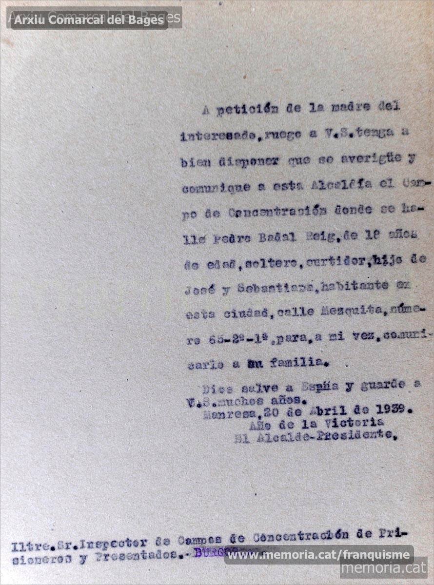 20/4/1939: petició de l’alcalde de Manresa al “Iltre. Sr. Inspector de Campos de Prisioneros y Presentados” de Burgos perquè l’informi del camp de concentració on hi ha el manresà Pere Badal Reig. (Arxiu Comarcal del Bages)