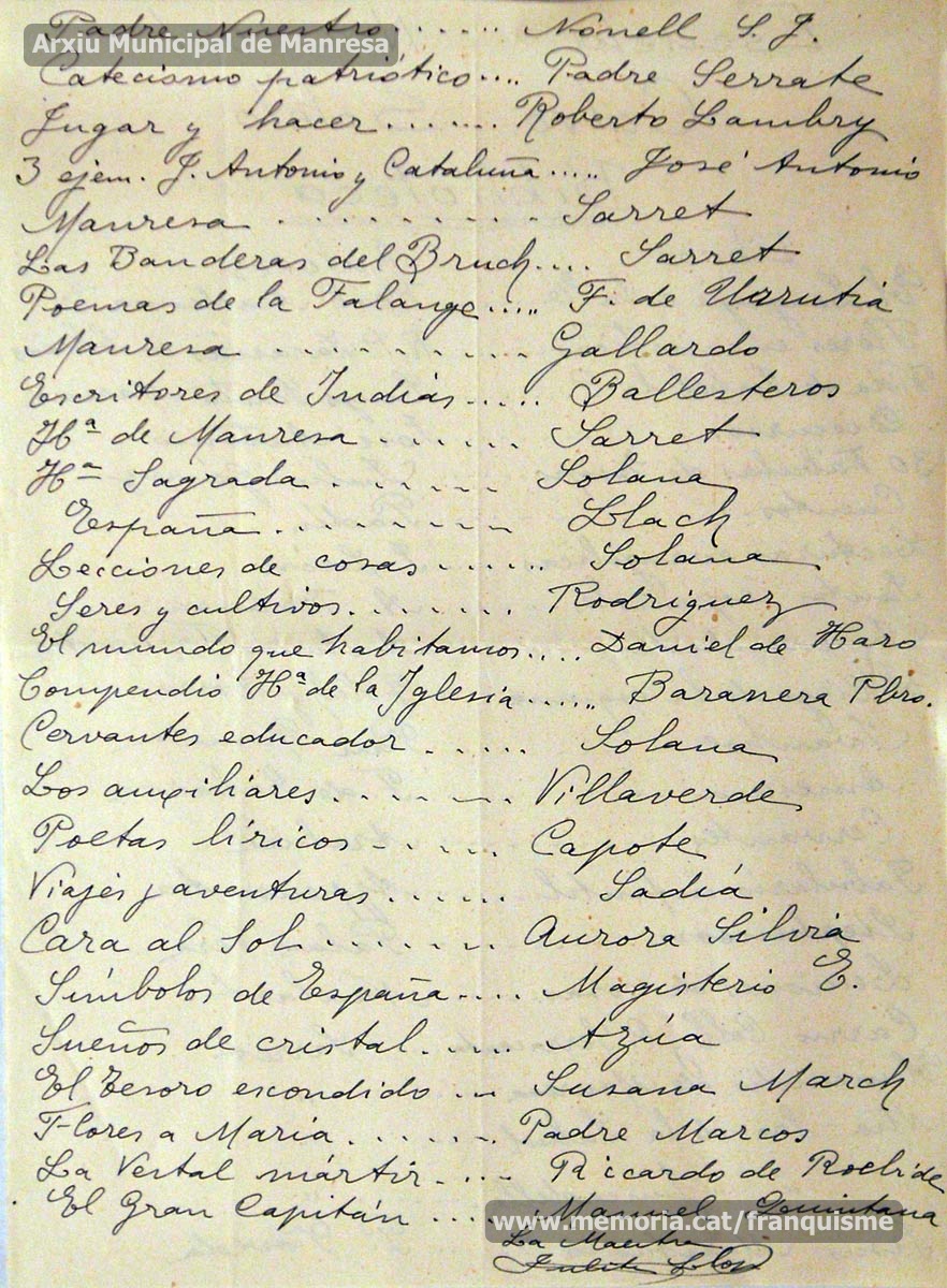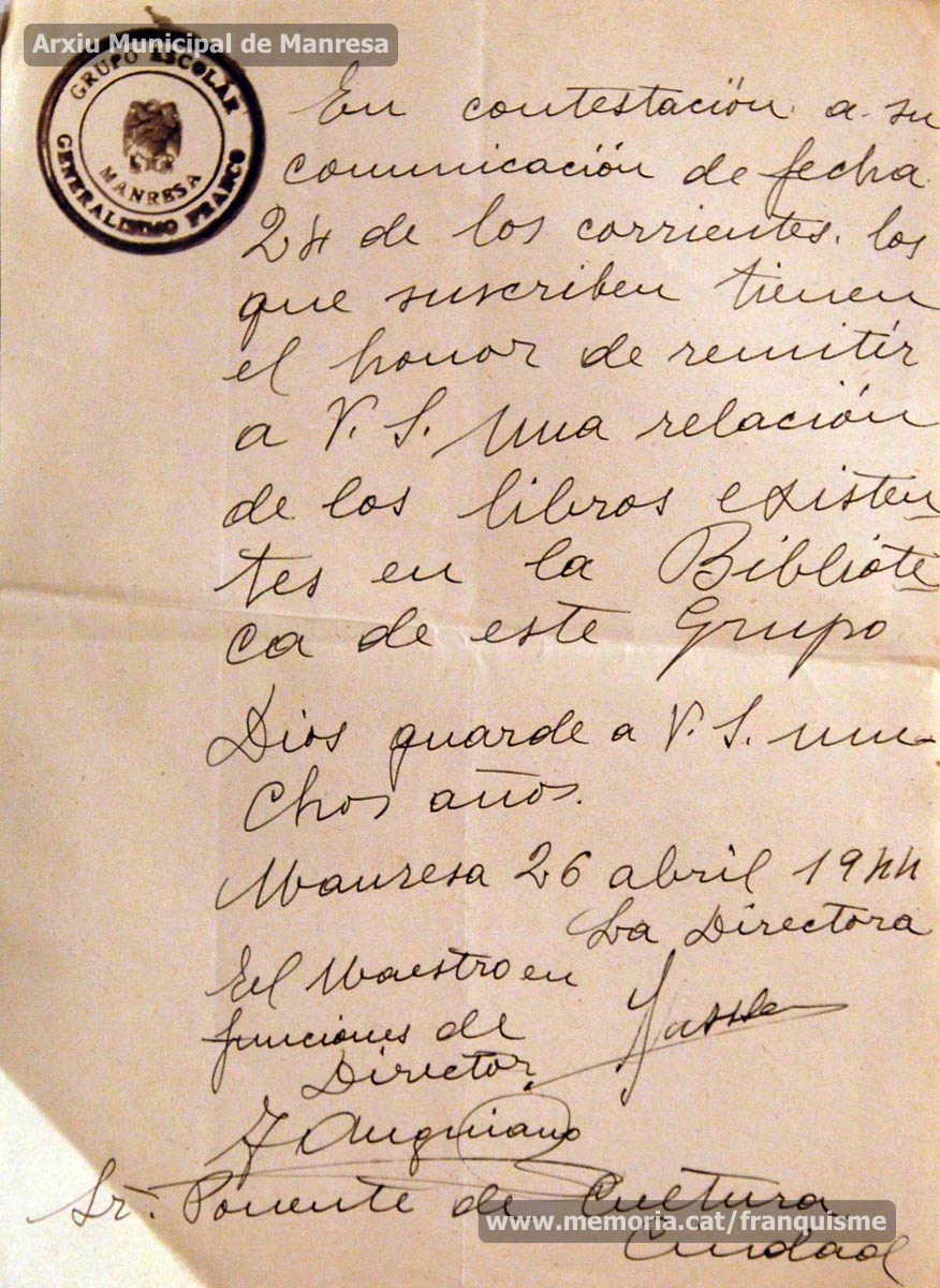 26/04/1944: notificació manuscrita dels directors del Grup Escolar “Generalísimo Franco” al ponent de Cultura de l’Ajuntament, en què li responen la seva petició de lliurar una relació de llibres de la biblioteca del centre escolar. La relació inclou títols com Por la Virgen Capitana, de José María Pemán, Pensando en los dolores de España, de Felipe González-Rojas, El secreto de la Falange, de Giménez Caballero, o Espejo y Gloria de España, de Lizondo. (Arxiu Municipal de Manresa)
