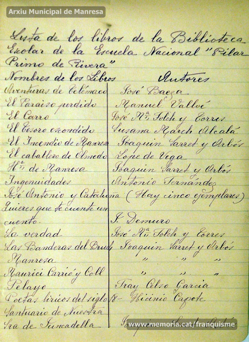 26/04/1944: relació de llibres de la Biblioteca de l’Escola de nens de Viladordis de Manresa, signada pel mestre Ramon Pallàs. Entre els títols destaquem Los Almogávares, de Manuel Vallvé, Teoría de la Falange, de Julián Pemartín, o José Antonio y Cataluña. (Arxiu Municipal de Manresa)