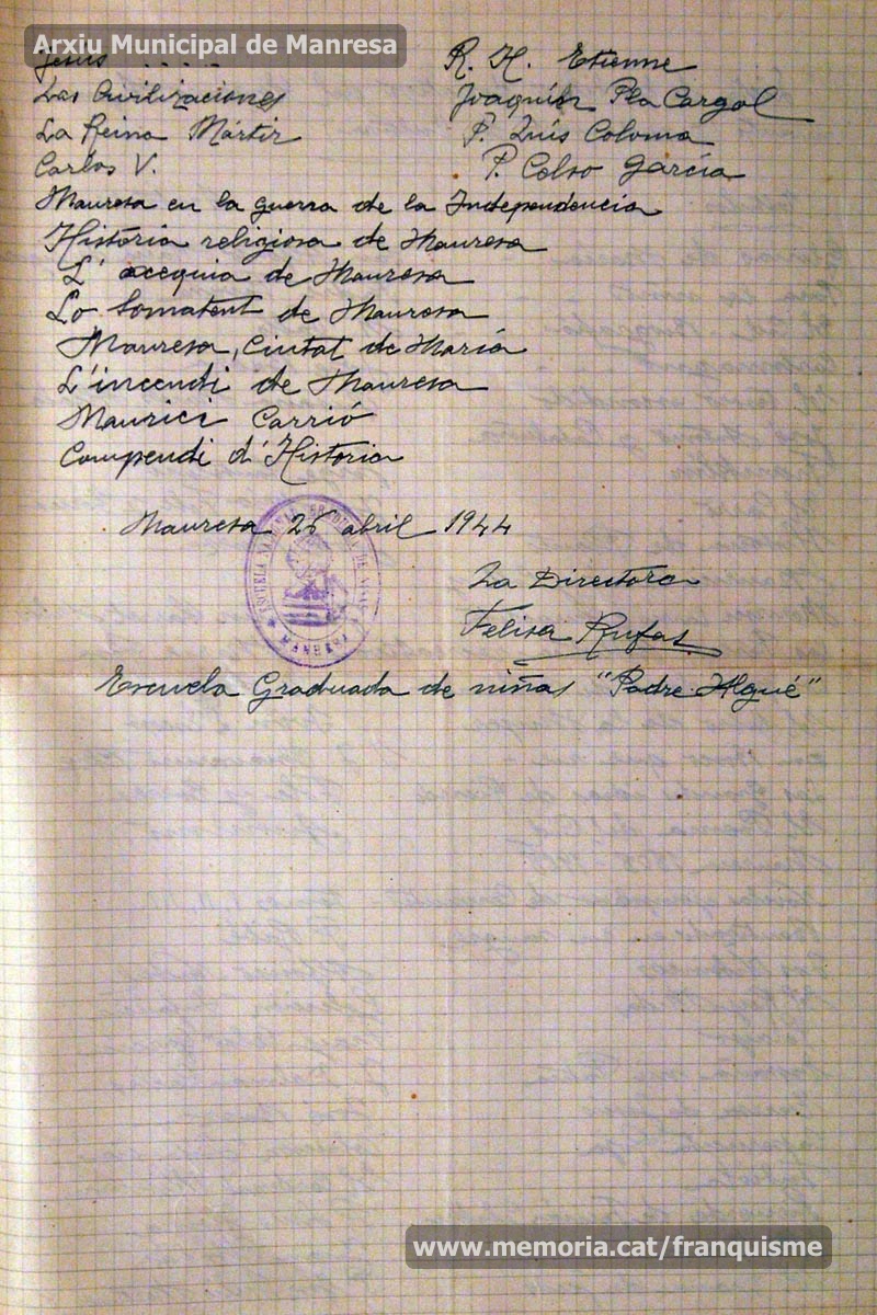 26/04/1944: relació de llibres, signada per la directora Felisa Rufas, lliurats per l’Ajuntament a l’Escola Graduada de nenes Pare Algué. Entre les obres figuren títols com España mi Patria o Historia religiosa de Manresa. (Arxiu Municipal de Manresa)