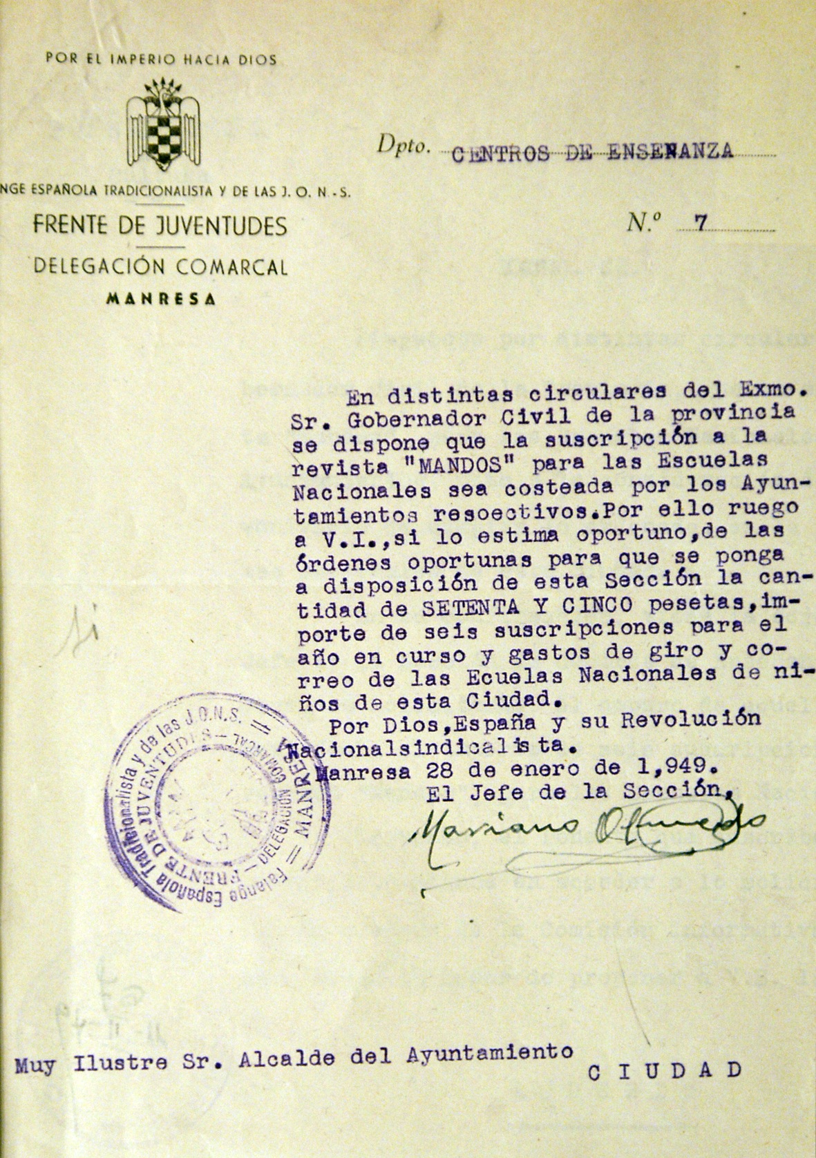 Gener-febrer de 1949: petició adreçada a l’alcalde pel “jefe de la Sección del Frente de Juventudes, Delegación Comarcal” de Manresa, Mariano Olmedo, perquè l’Ajuntament es faci càrrec de la subscripció de la revista Mandos per a les escoles de nens, segons directrius donades pel governador civil. L’Ajuntament acorda destinar 77,15 pessetes a sis subscripcions de la revista per a les escoles. (Arxiu Municipal de Manresa)