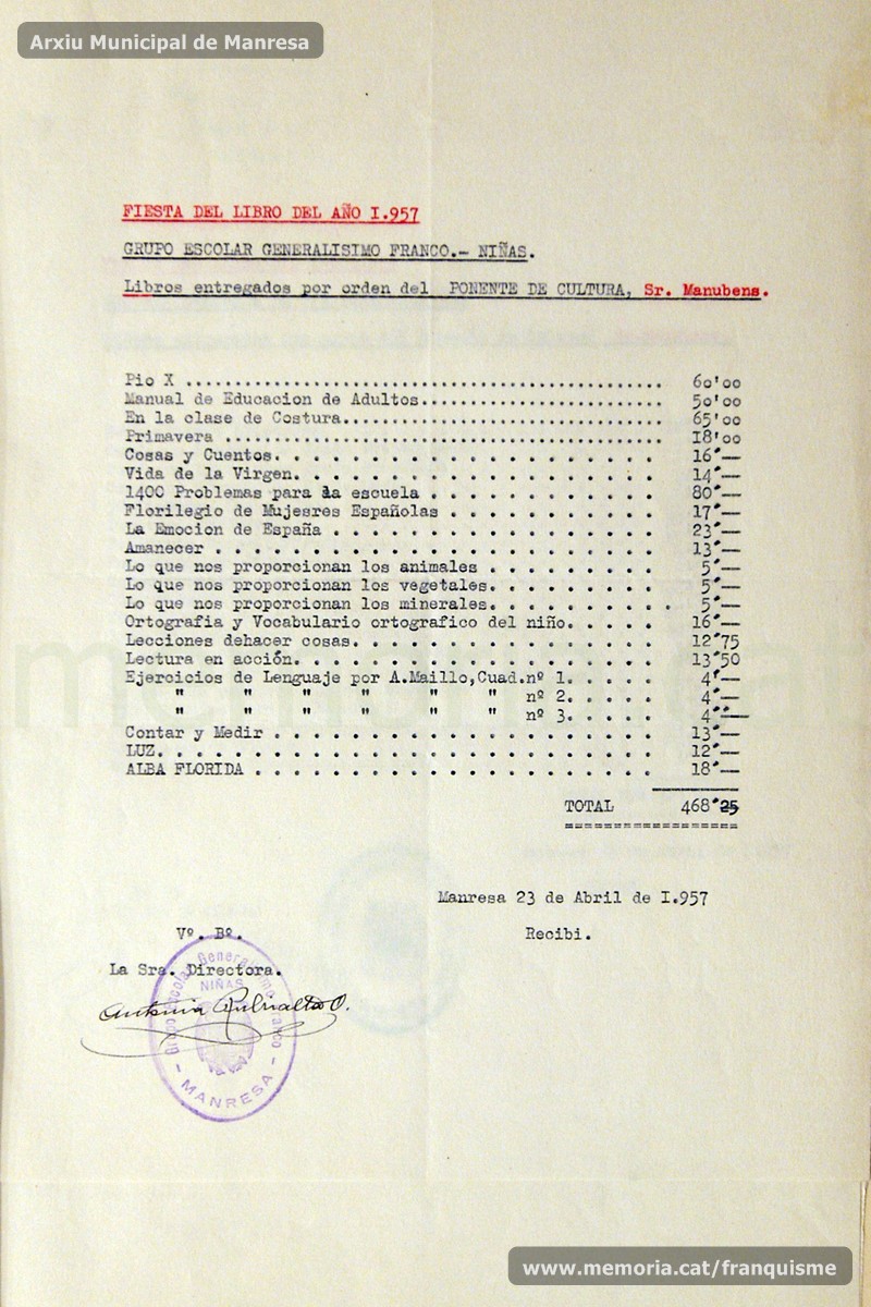 23/04/1957: relació de llibres lliurats per ordre del ponent de Cultura de l’Ajuntament de Manresa al Grupo Escolar Generalísimo Franco de nenes, amb motiu de la Fiesta del libro. Entre les donacions, que tenen una despesa de 468’25 pessetes, destaquen títols com En la clase de costura, Vida de la Virgen, Florilegio de Mujeres Españolas o La Emoción de España. (Arxiu Municipal de Manresa)