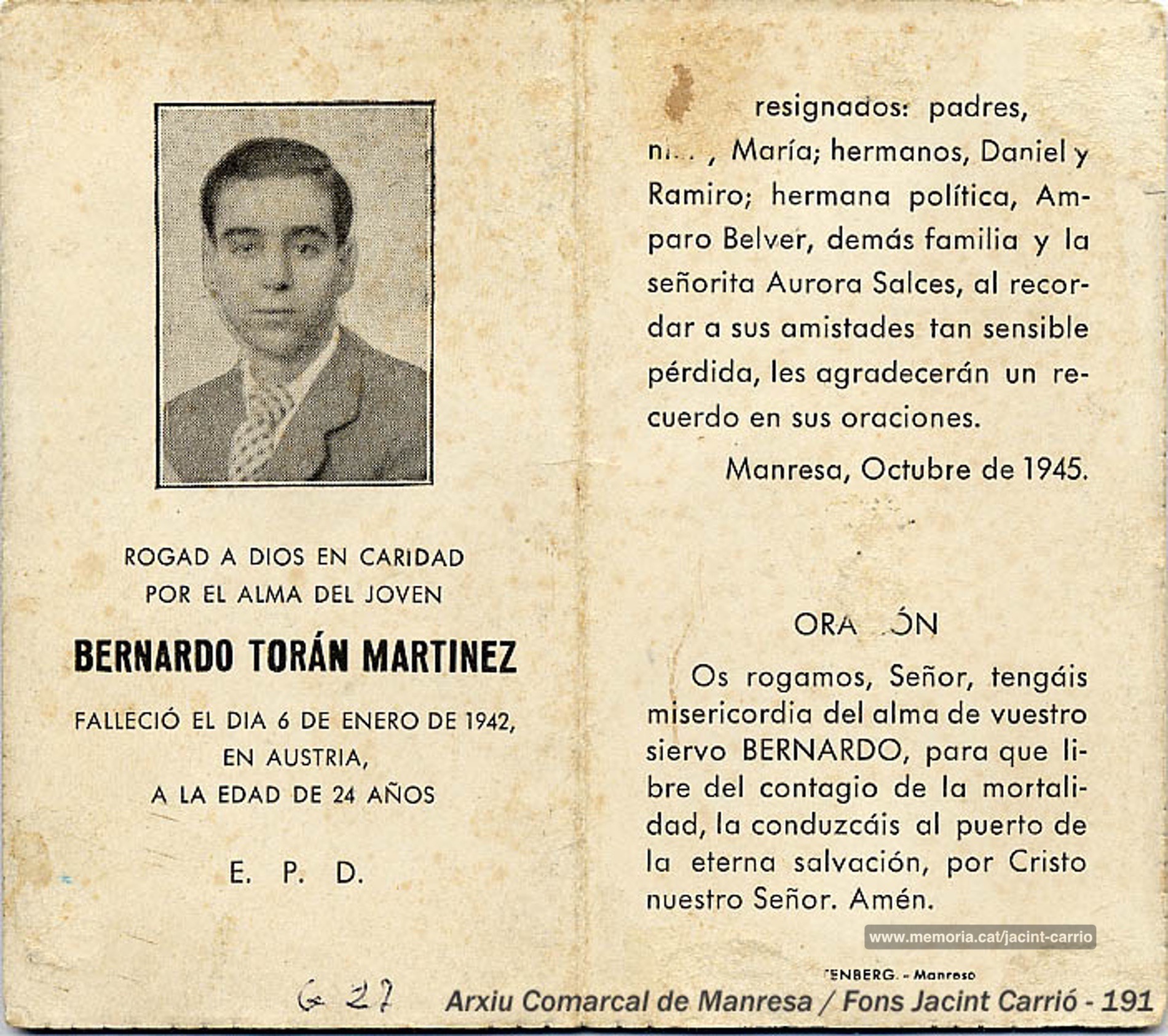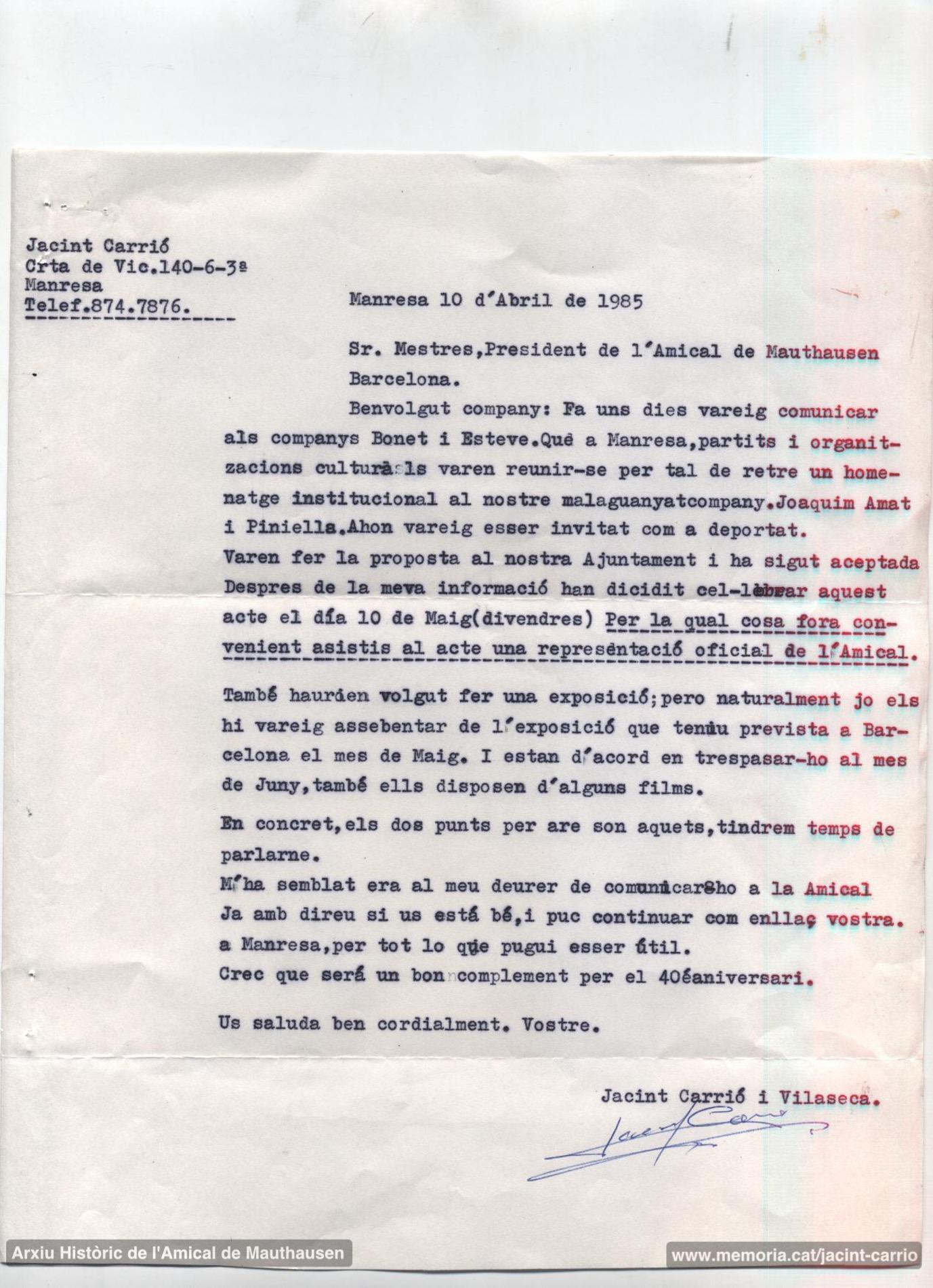 10-4-1985. Carta de Jacint Carrió a Joan Mestres, president de l’Amical de Mauthausen, sobre l’homenatge que la ciutat de Manresa retrà a Joaquim Amat-Piniella el dia 10 de maig. Carrió li diu: “fóra convenient assistís a l’acte una representació oficial de l’Amical... M’ha semblat era el meu deure de comunicar-ho a l’Amical. Ja em direu si us està bé i puc continuar com enllaç vostre a Manresa, per tot el que pugui ser útil. Crec que serà un bon complement per al 40è aniversari [de l’alliberament dels camps nazis]”. (Arxiu Històric de l’Amical de Mauthausen).