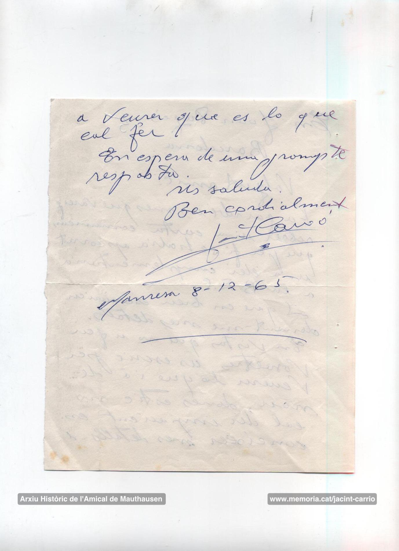 8-12-1965: Carta de Jacint Carrió a Joan Pagès en què li demana què en sap d’una llei complementària que finalment ha estat aprovada i que permetria cobrar les indemnitzacions del govern alemany. (Arxiu Històric de l’Amical de Mauthausen).