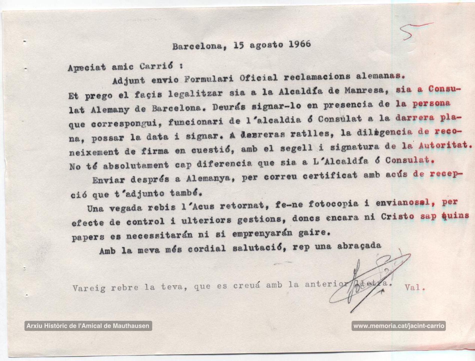 15-8-1966: Carta de Joan Pagès a Jacint Carrió en què li adjunta el formulari per a reclamar les indemnitzacions alemanyes als camps nazis. El procés per aconseguir aquestes compensacions econòmiques va ser molt llarg. Fixeu-vos com al final de la carta, Pagès exclama: “ni Cristo sap quins papers es necessitaran ni si emprenyaran gaire”. (Arxiu Històric de l’Amical de Mauthausen).