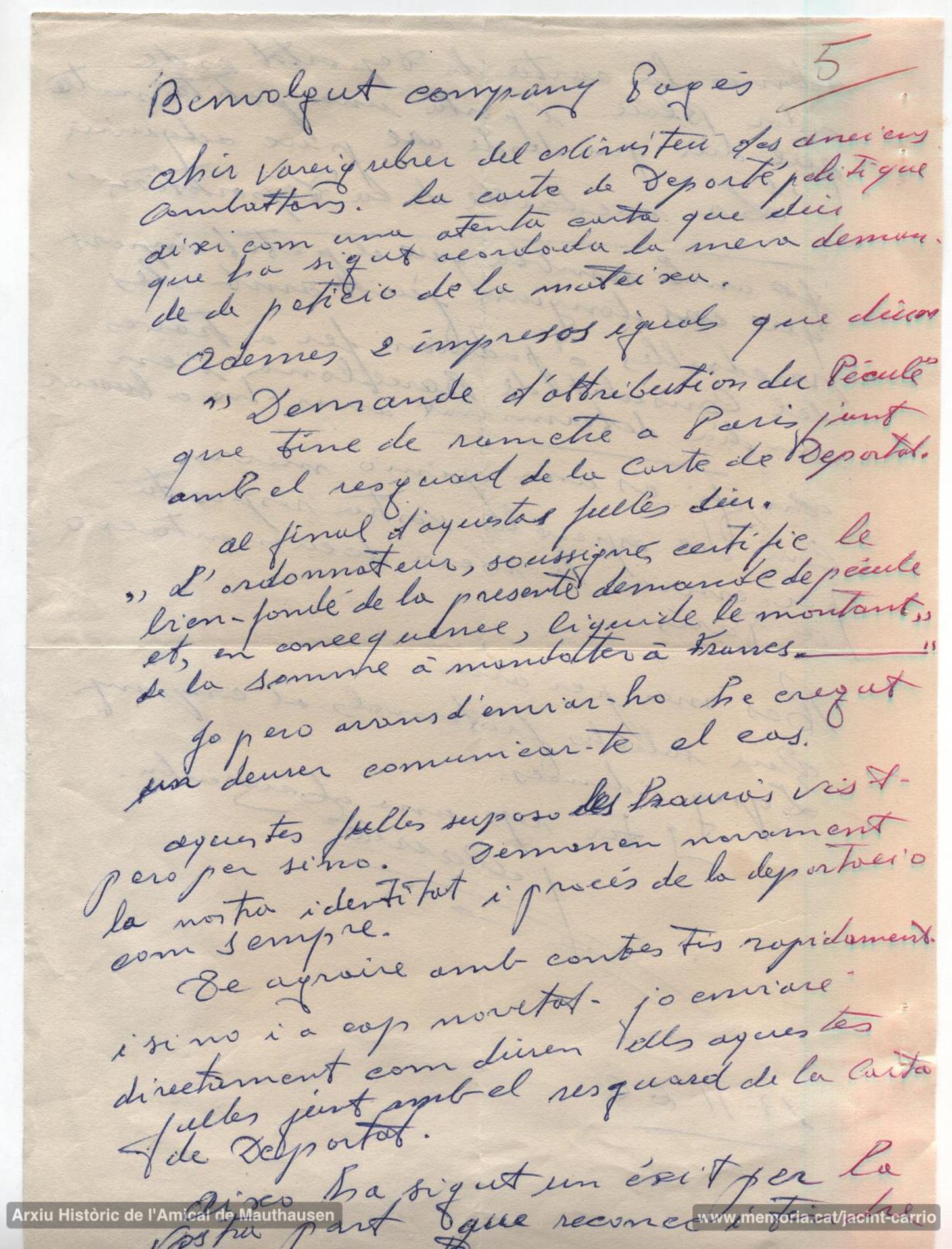 22-5-1985. Carta de Jacint Carrió a la filla d’un deportat, que ha conegut en el viatge a Mauthausen, en la commemoració del quarantè aniversari de l’alliberament. Li explica que va coincidir amb el seu pare en diferents moments de la diàspora de l’exili fins a l’arribada a Mauthausen, on “al cap de pocs dies el perdia de vista”.