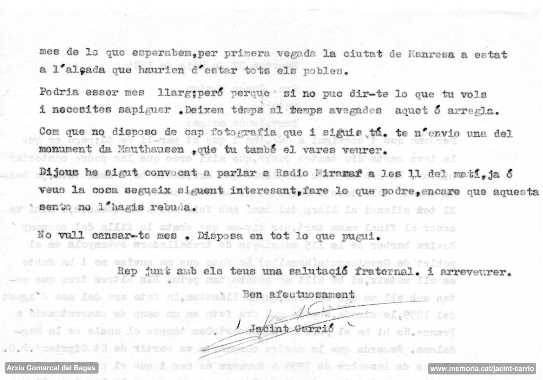 ![17-5-1968. Carta de l’Amical a Jacint Carrió en què se li informa dels darrers actes celebrats per l’entitat. El final de la carta diu: “Nuestro espíritu no debe morir. Que jamás pueda haber otros Mauthausen en la historia”. També se li fa saber que alguns deportats han començat a cobrar les indemnitzacions [del govern alemany] i afegeix: “Cierto es que lo que se nos va a dar es una limosna... Tienen prisa en enterrar su verguenza”. (Arxiu Històric de l’Amical de Mauthausen).](https://www.memoria.cat/jacint-carrio/wp-content/uploads/sites/75/2022/12/034-Jacint-Carrio-Manresa.jpg)