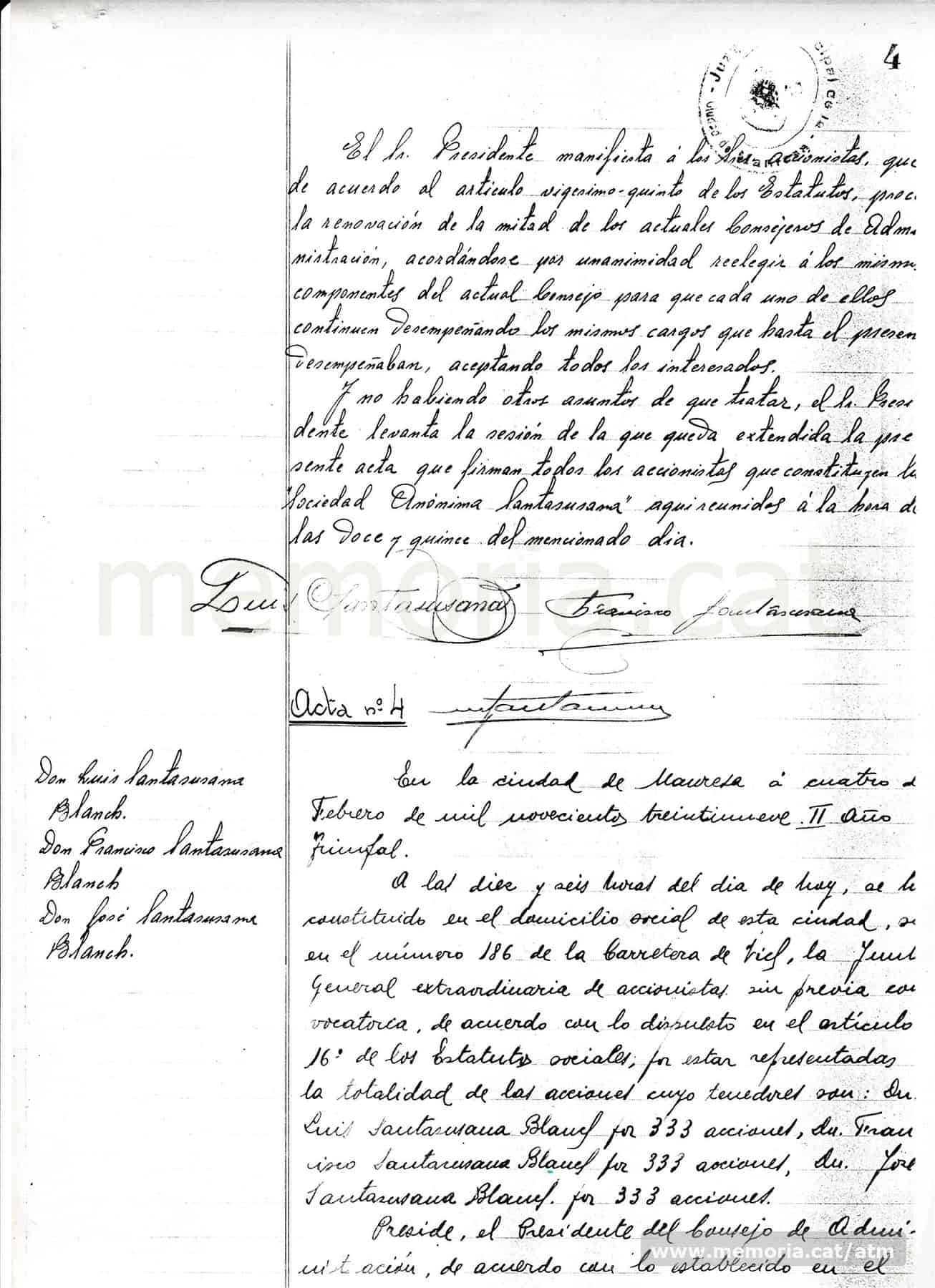 La reunió va tenir lloc el 4 de febrer del 1939, és a dir, pocs dies després de l’entrada de les tropes franquistes a Manresa. De la seva lectura se’n desprenen detalls rellevants com ara que la reunió s’havia fet sense convocatòria prèvia “por estar representadas la totalidad de las acciones” en les persones dels germans Luis, Francisco i José Santasusana Blanch. El primer actua com a president i el darrer com a secretari.