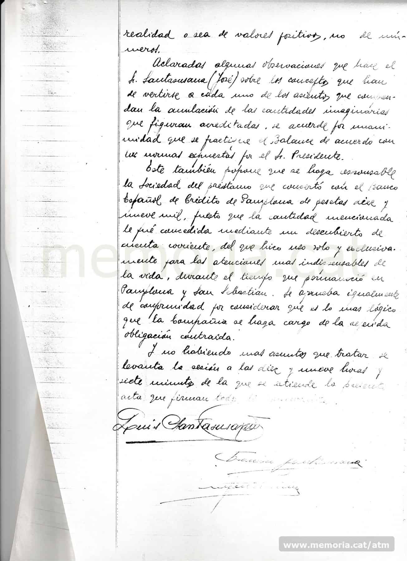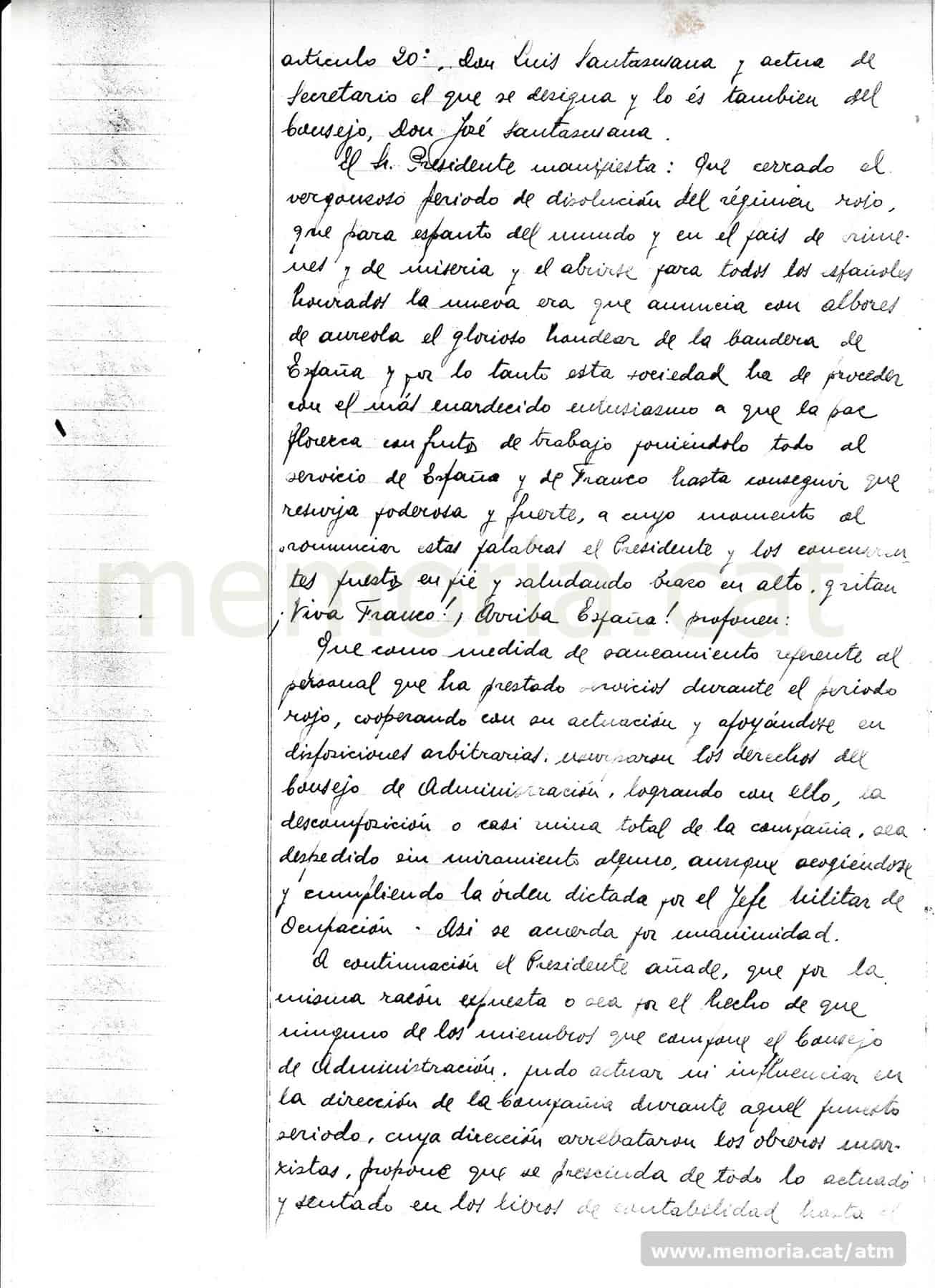 Segons l’acta, “al pronunciar estas palabras el Presidente y los concurrentes puestos en pie y saludando brazo en alto, gritan ‘¡Viva Franco! ¡Arriba España!’” i proposen “que como medida de saneamiento referente al personal que ha prestado servicios durante el período rojo, cooperando con su actuación y apoyándose en disposiciones arbitrarias, usurparon los derechos del Consejo de Administración, logrando con ello, la descomposición o casi ruina total de la compañía, sea despedido sin miramiento alguno…”