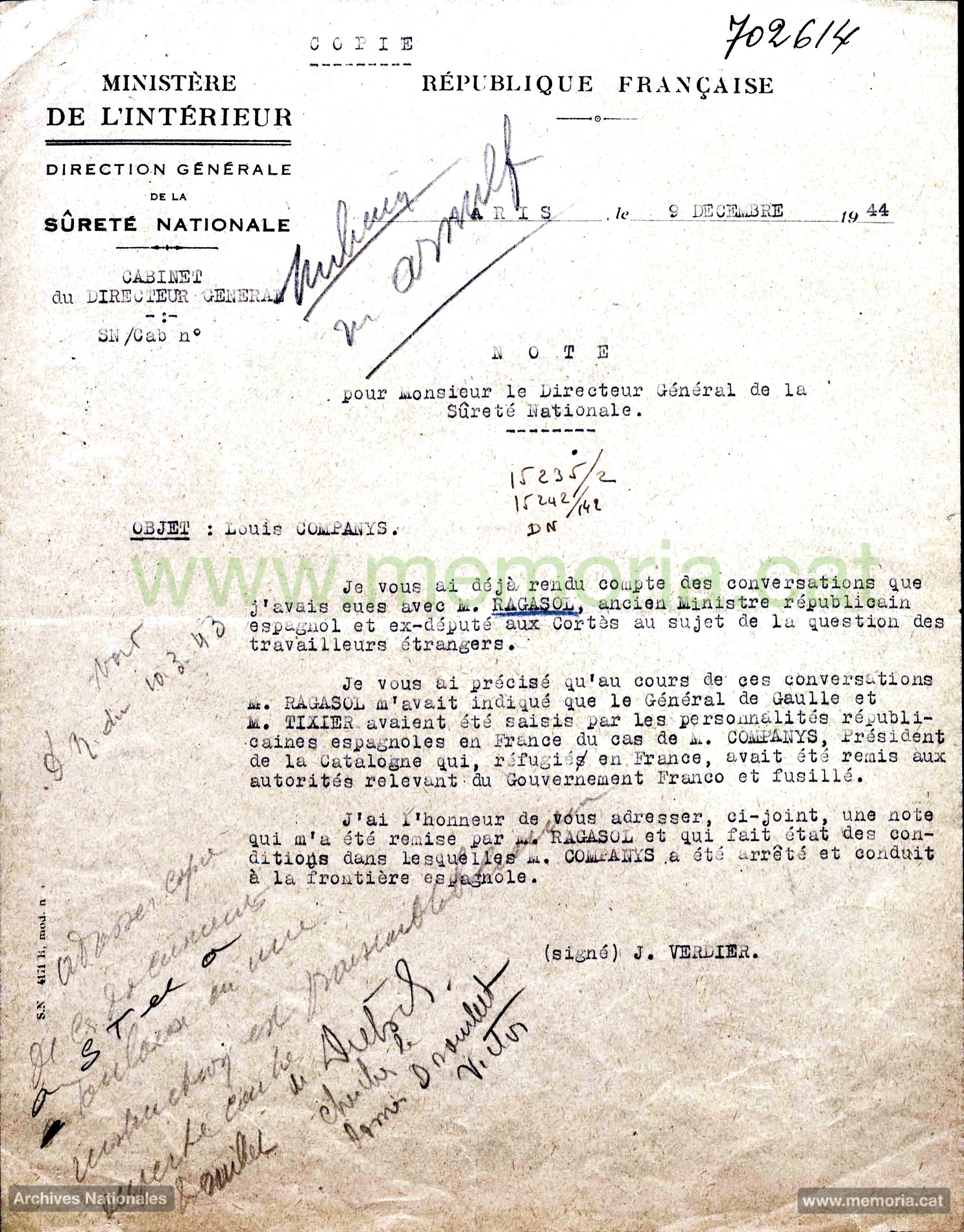 Verdier informa el cap de la policia que l’ex-ministre Ragasol li havia fet notar que tant De Gaulle com Tixier (es tracta d’Adrien Tixier, ministre de l’interior) havien estat informats per personalitats republicanes espanyoles del cas de Lluís Companys, president de la Generalitat, que tot i estar refugiat a França, havia estat lliurat a les autoritats franquistes i afusellat. L’informe que li envia explica les condicions en què Companys havia estat detingut i conduït a la frontera.