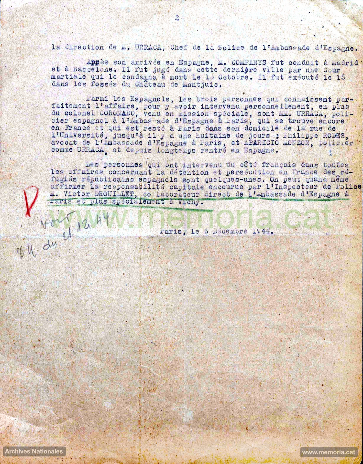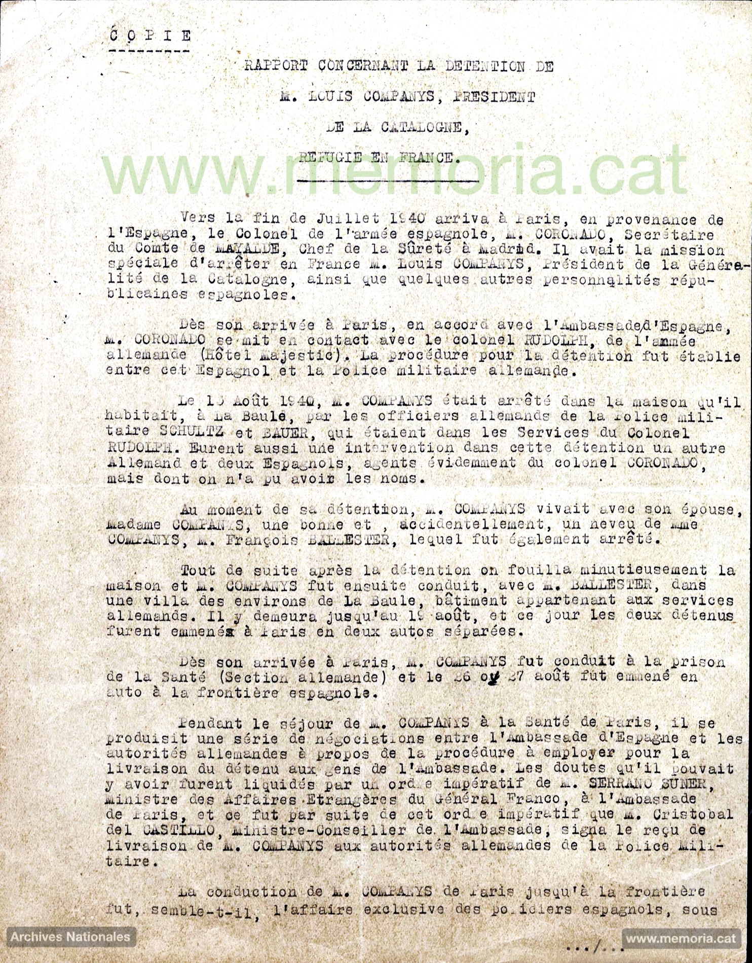 Informe sobre la detenció de Lluís Companys, president de Catalunya, refugiat a França