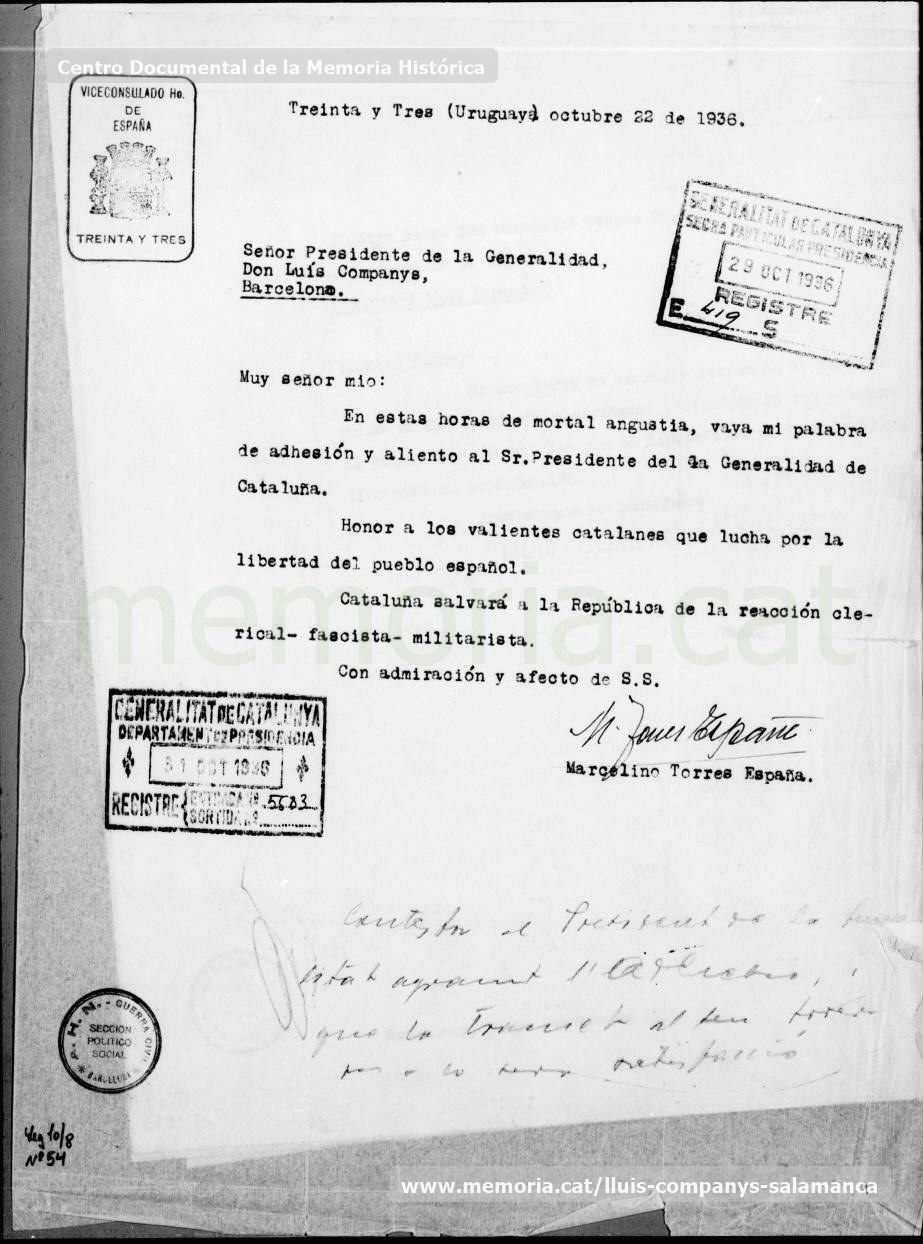 Octubre de 1936: carta del Vice-cònsol d’Espanya a l’Uruguai, d’adhesió a Lluís Companys i resposta del president.