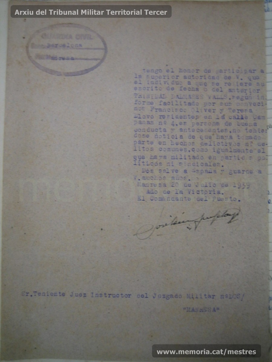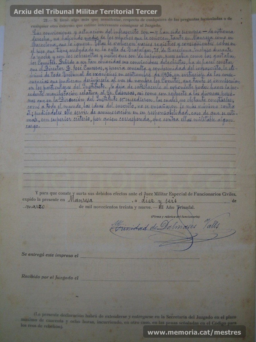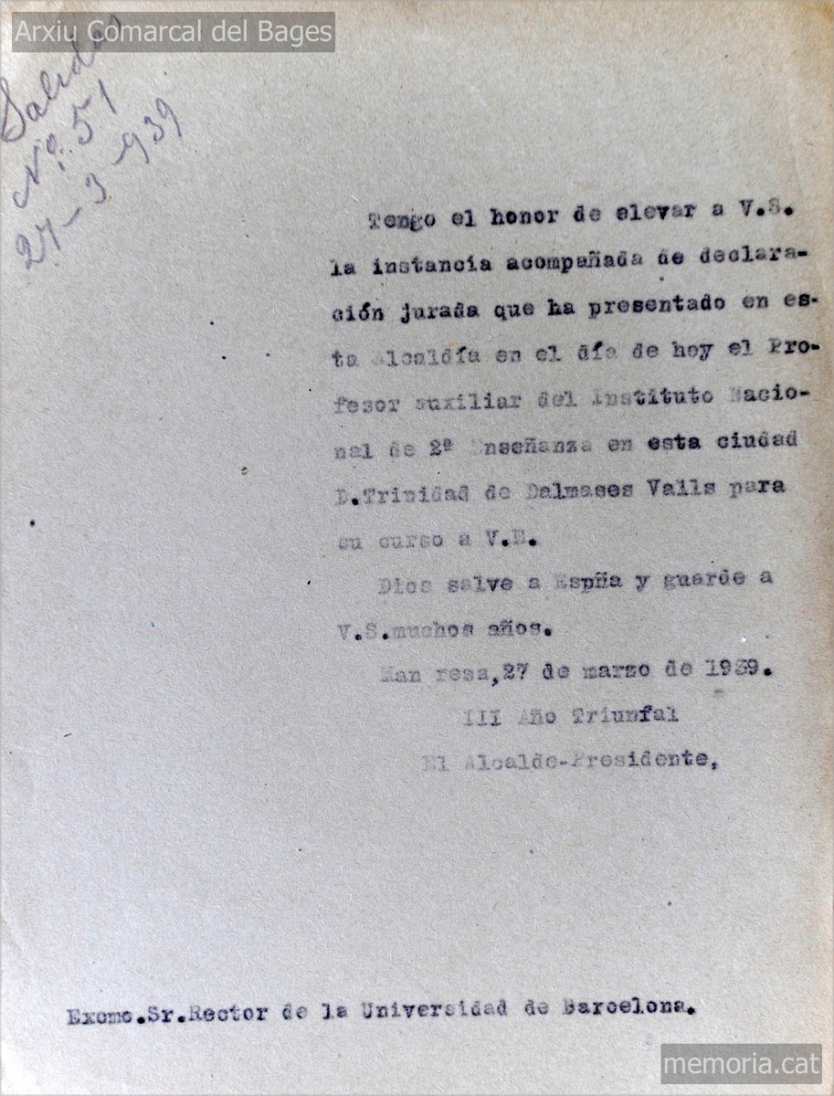 27/03/1939: notificación del alcalde de Manresa al rector de la Universitat de Barcelona, por la cual le adjunta la instancia acompañada de la declaración jurada que ha presentado el profesor auxiliar del Instituto Nacional de 2ª Enseñanza, Trinitat de Dalmases Valls. (Arxiu Comarcal del Bages)
