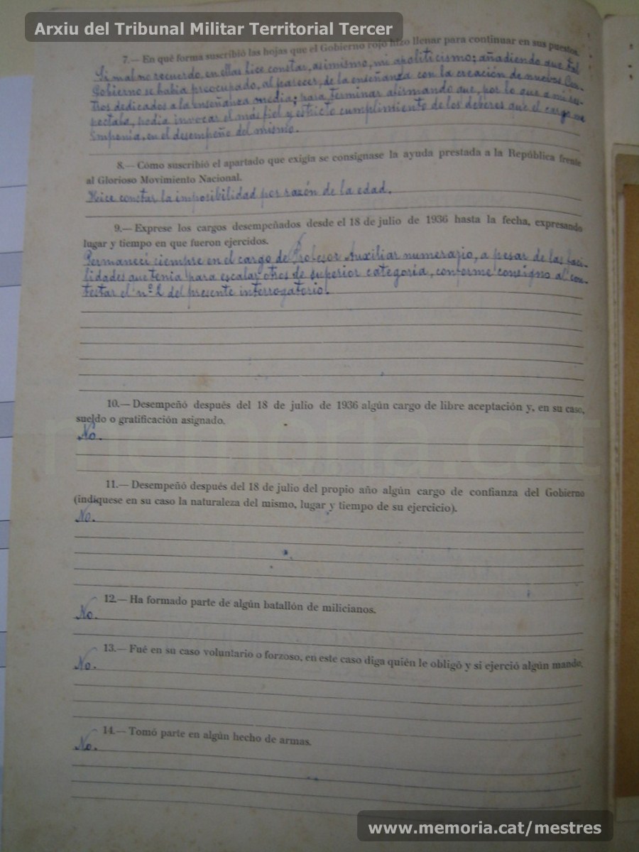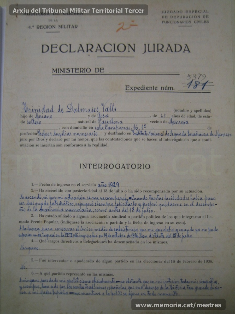 Selección de páginas del expediente de depuración del profesor del instituto Trinitat de Dalmases Valls (en algunos documentos se observan confusiones sobre el nombre Trinitat, que puede ser masculino o femenino y, en algún caso, es presentado erróneamente como una mujer). (Archivo General de la Administración)