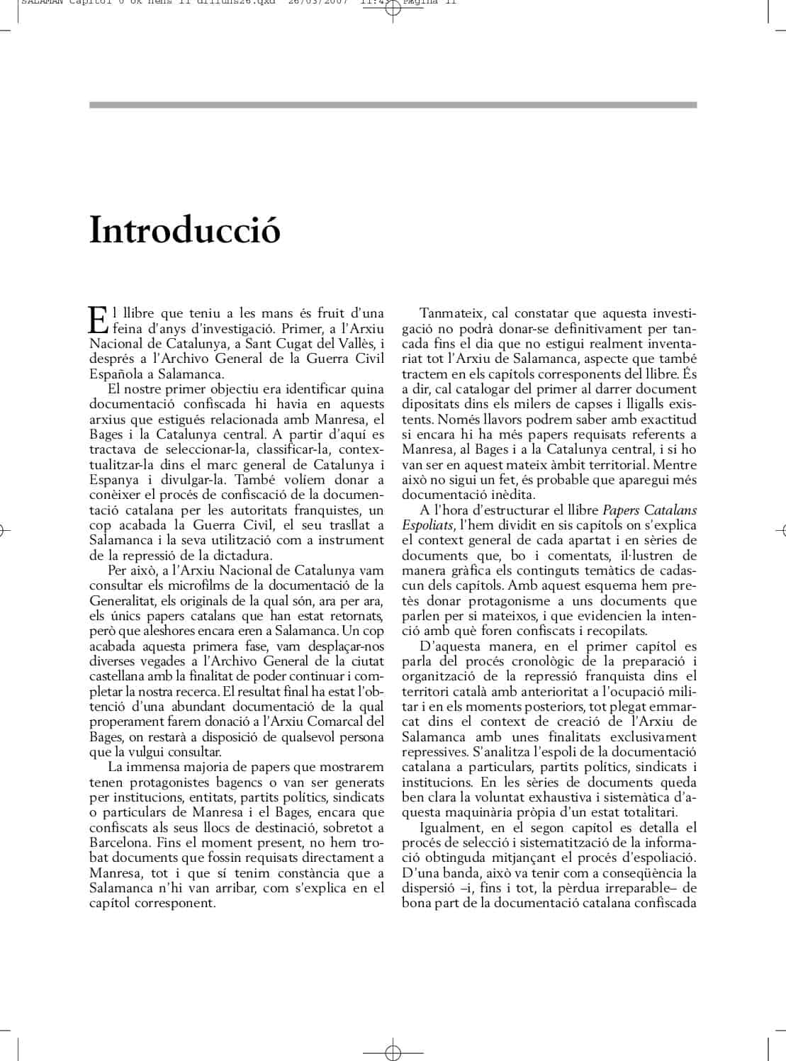 Sinopsi: El llibre recull dos-cents documents, després d’anys d’investigació, tant a l’Arxiu Nacional de Catalunya com a l’Archivo de la Guerra Civil de Salamanca, i posa en evidència la relació entre la documentació confiscada a Catalunya i la repressió franquista.