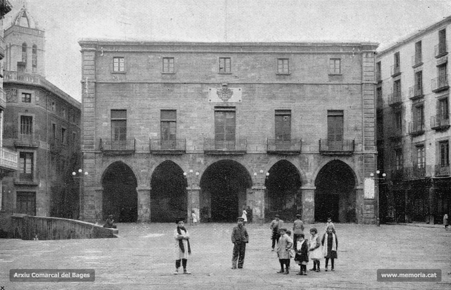 Fotografia aèria de la Plaça Major i de la Casa de la Ciutat l'any 1926. Al fons, l'antic Jutjat, la porta lateral de la Seu, la casa del Paborde i la Rectoria. La plaça ofereix un aspecte molt concorregut: les parades del mercat, gent que manté una actitud expectant davant els treballs d'ornamentació de la façana de l'edifici de l'Ajuntament. Aquest era i és el punt neuràlgic de la ciutat: plaça del mercat de l'horta manresana, punt de manifestacions i protestes i de celebracions polítiques, l'indret preferit per escoltar les bandes de música dels regiments destacats a la caserna del Carme; lloc, en darrer terme, on es rebien amb tots els honors les personalitats que visitaven la ciutat. En aquests moments, hom considerava que fer el mercat en aquesta plaça pública era un signe d'endarreriment, i s'afirmava que «tot el progrés que podem mostrar al nostres visitants en l'ordre de la construcció, comerç i fabricació, i fins, si voleu, de mesures i reformes urbanes en determinats indrets de la ciutat, resta eclipsat quan es topa amb aquest relleu de la venda al carrer, i ens col·loca en una situació d'inferioritat manifesta, total, davant de les ciutats que posseeixen un Mercat tancat a propòsit per aquest servei públic».