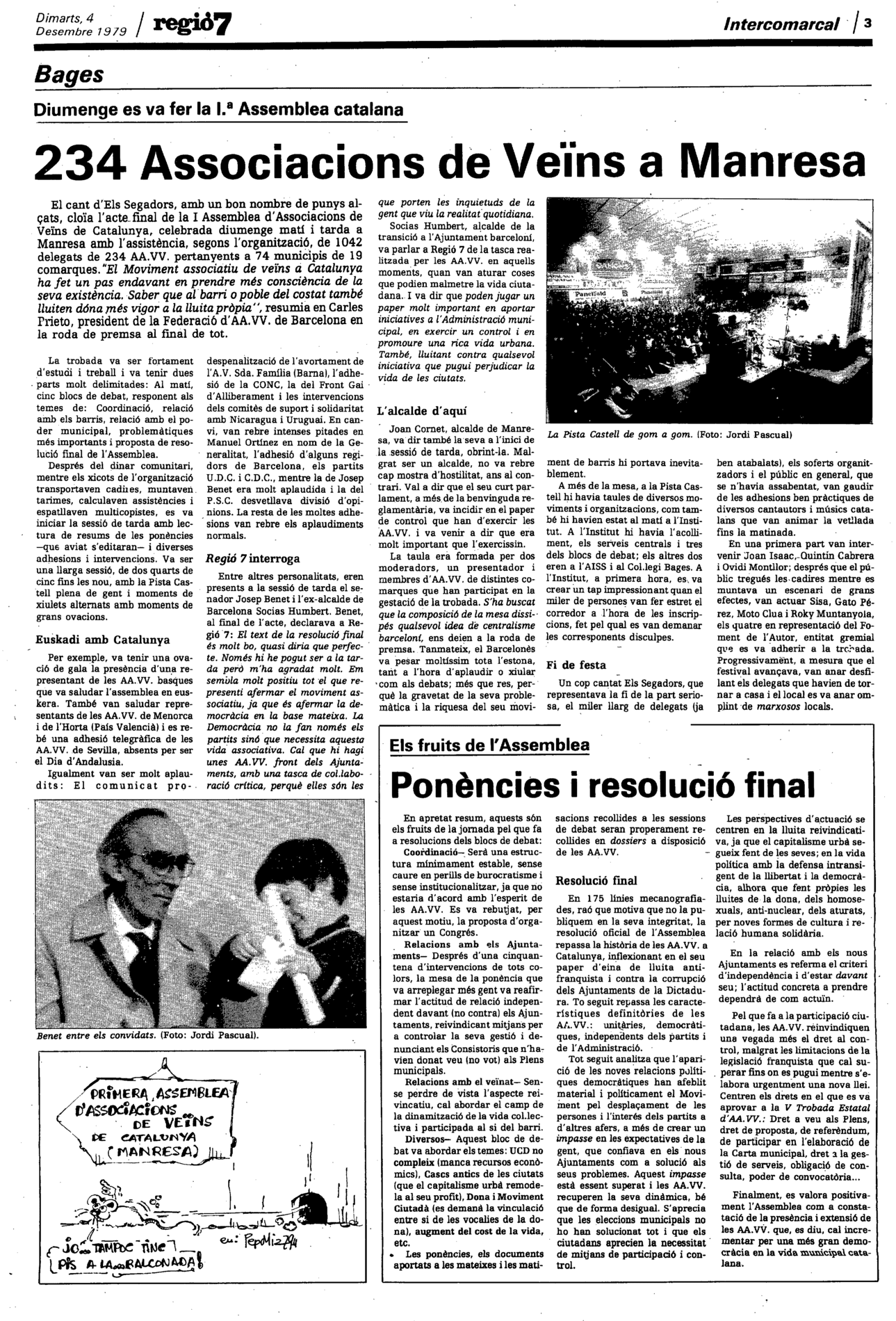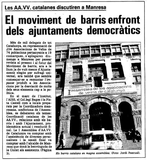 La 37a assemblea de la Confederació d’Associacions Veïnals de Catalunya, la CONFAVC, es va reunir dissabte 2 d’abril de 2022 a la sala Plana de l’Om de Manresa, on hi caben menys de dues-centes persones. Però més de quaranta anys abans, el 2 de desembre del 1979, la ciutat ja havia acollit els representants del moviment veïnal de tot el país en la Primera Assemblea d’Associacions de Veïns de Catalunya, i els assistents no haurien pas cabut a la Plana (sala que llavors no existia). De fet, per desenvolupar el seu extens programa van necessitar tres seus: l’Institut Lluís de Peguera, el col·legi Bages i la desapareguda Pista Castell, recinte esportiu que va acollir a la tarda la part final, precedida pel treball en comissions del matí. El pavelló va quedar ple amb els més de mil delegats que representaven un total de 234 associacions de veïns de 74 poblacions pertanyents a 19 comarques, en un moment en què l’associacionisme veïnal tenia una força enorme però alhora li calia redefinir el seu paper «a la llum ja de vuit mesos d’Ajuntaments elegits per sufragi universal, ara també que sembla començar-se a remuntar l’impàs produït a les associacions per la desviació de molts dels seus elements cap a la política», tal i com ho vaig escriure a la portada del Regió7 del dimarts següent (en aquells moments li dèiem «diari» per aspecte i vocació, però es publicava dos cops per setmana, dimarts i dissabtes).